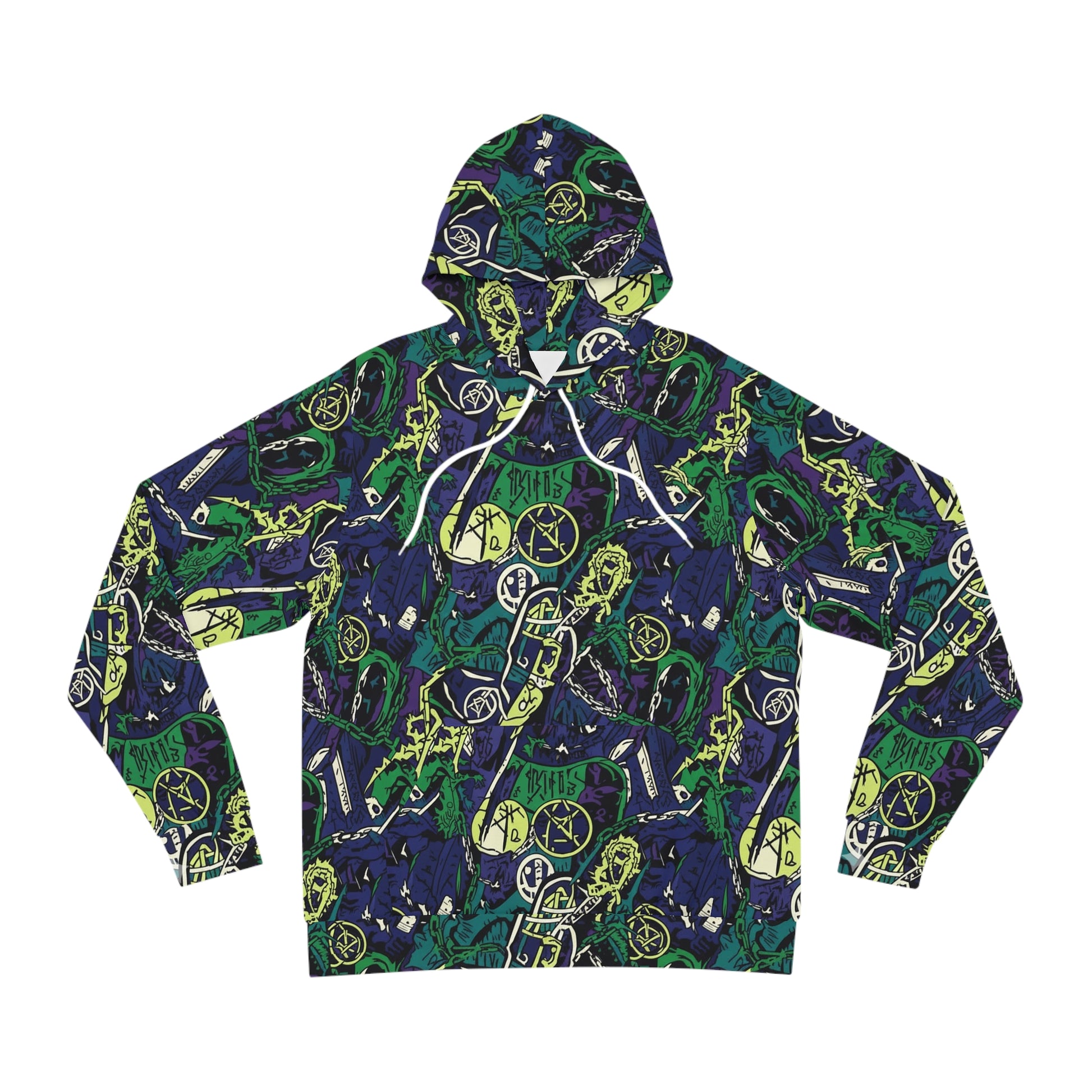 This hoodie feels like a midnight skate session under neon streetlights — loud, layered, and alive. The all-over print wraps you in a collage of graffiti-style icons and jagged shapes in deep navy, forest green, and electric lime. It’s roomy enough to toss on over a tee, pull the hood up, and keep moving when the air gets crisp. The kangaroo pocket shelters your hands or essentials. Durable double-stitched seams and a medium-heavy knit give it structure that holds the print’s energy wash after wash. Wear it to late-night shows, city rides, or when you want your outfit to say something bold without saying a single word.