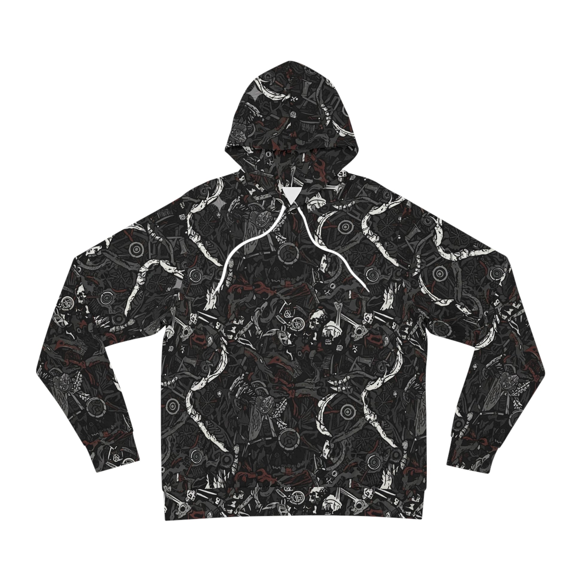 This all-over print hoodie brings a dark, detailed mood to every day. Heavy, smooth fabric holds the intricate monochrome illustrations — swirling bones, vintage bikes, gears and shadowed figures — so the design reads clearly across the hood, sleeves and kangaroo pocket. Wear it when you want to blend utility with an artful, slightly gritty aesthetic: morning rides through damp streets, late-night shows, or layered under a coat for colder commutes. The roomy hood and deep pouch pocket keep you warm without losing the design’s flow. It feels lived-in fast: durable seams, soft stretch, and a printed care label for fuss-free upkeep. For people who collect visual stories in their wardrobe, this hoodie looks like it belongs in a sketchbook and on the road.