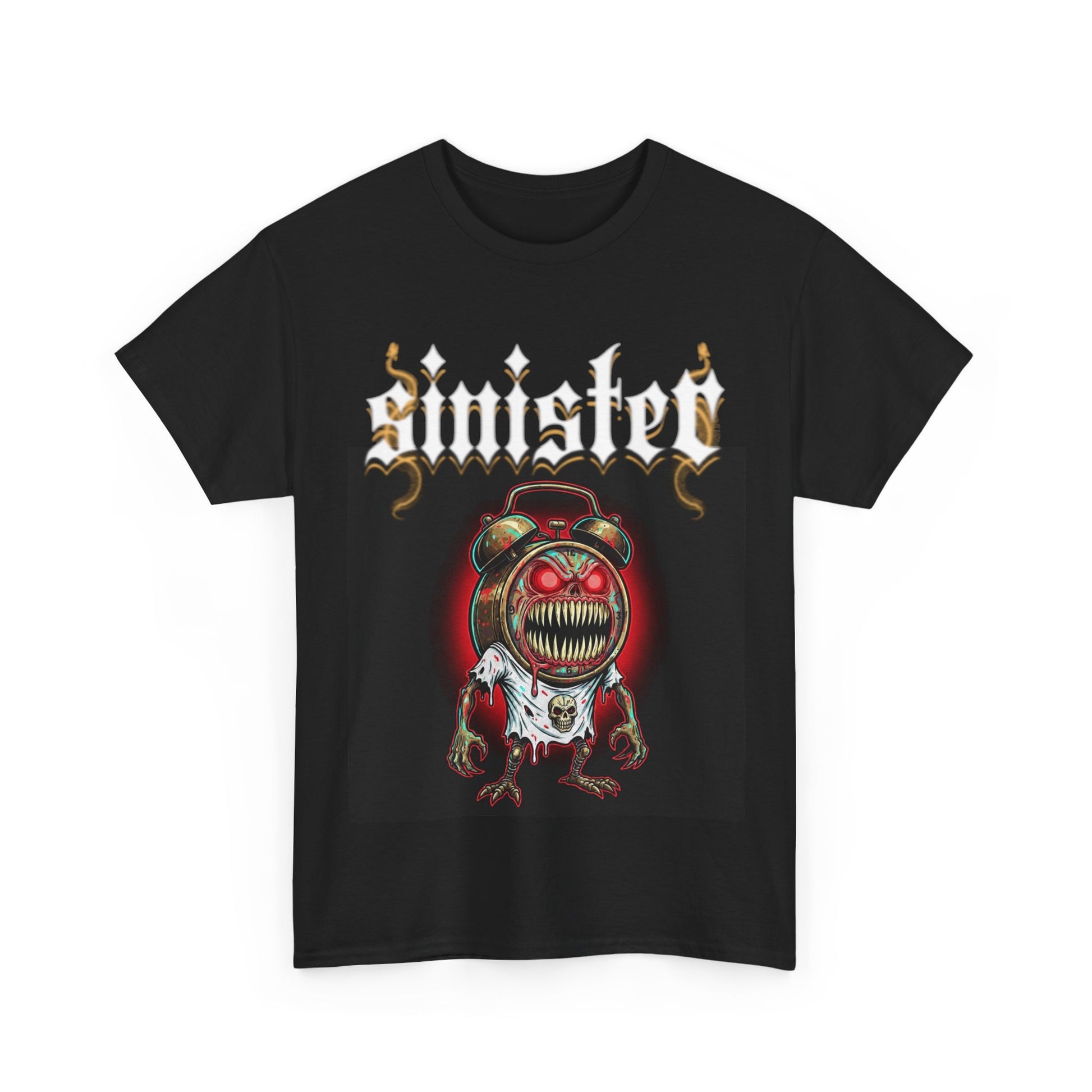 This tee carries a dark, playful edge — a bold graphic of a grinning, clock-faced creature in vintage horror-poster tones with a gothic “sinister” wordmark above. Worn with a slouchy jacket or layered under a flannel, it brings a little underground attitude to evenings out, late-night shows, or haunted-season hangs. The medium-weight cotton holds print detail sharply while staying breathable; the classic crew and relaxed cut make it easy to move in and style for everyday wear. For listeners of heavy riffs, collectors of horror art, and anyone who leans into macabre humor, this shirt reads like a band patch turned wearable poster — loud, detailed, and unapologetically spooky.