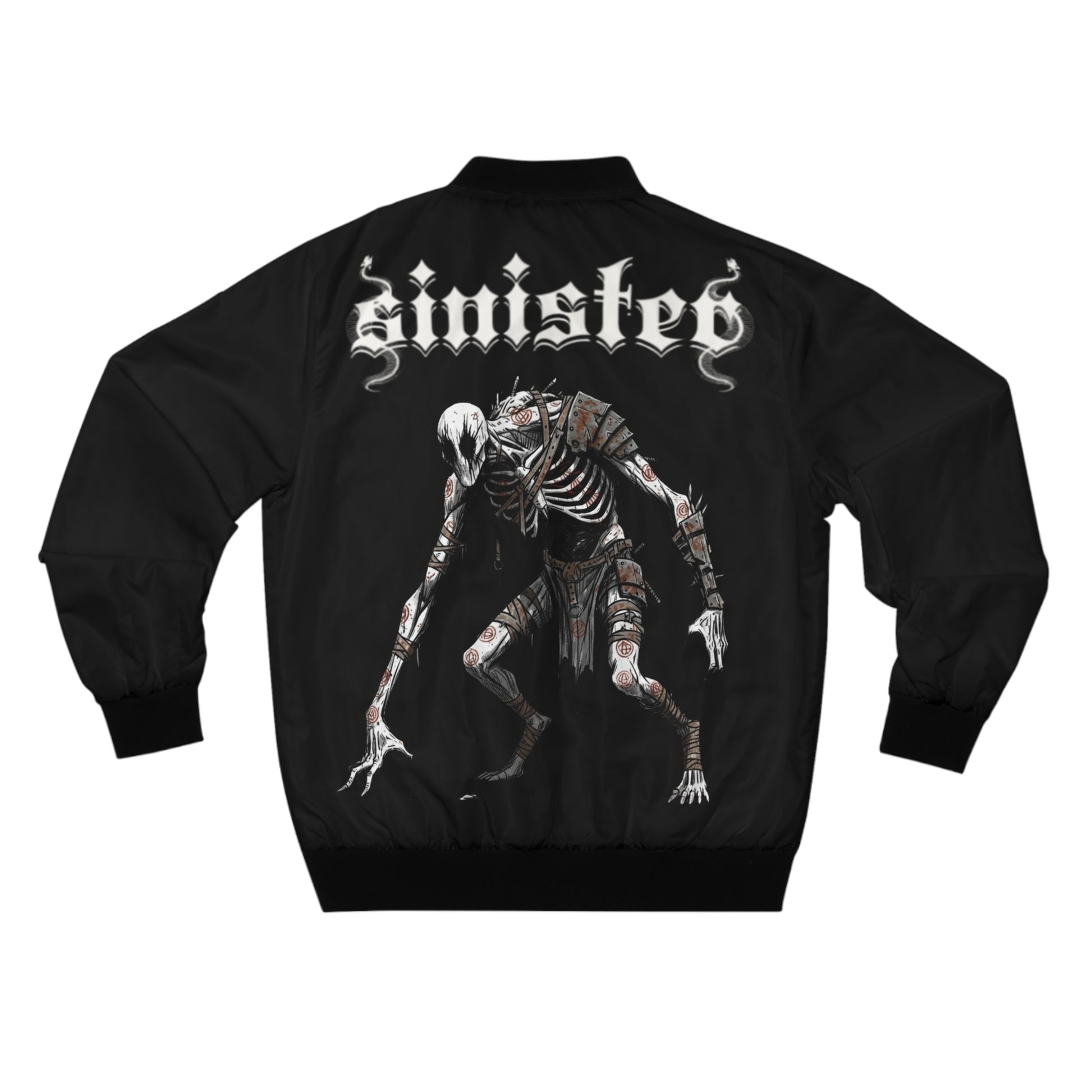 A shadowy, statement bomber that brings underground metal energy to everyday wear. This all-over printed jacket pairs a stark black canvas with a detailed skeletal warrior on the back and a matching band-style wordmark across the chest. The heavyweight polyester shell holds printed art crisply and stands up to wind and light rain, while the dark blue lining keeps the inside low-profile. Rib-knit collar, cuffs, and hem add structure and a classic bomber silhouette. Wear it on late-night drives, to shows, or when you want your outerwear to speak before you do.