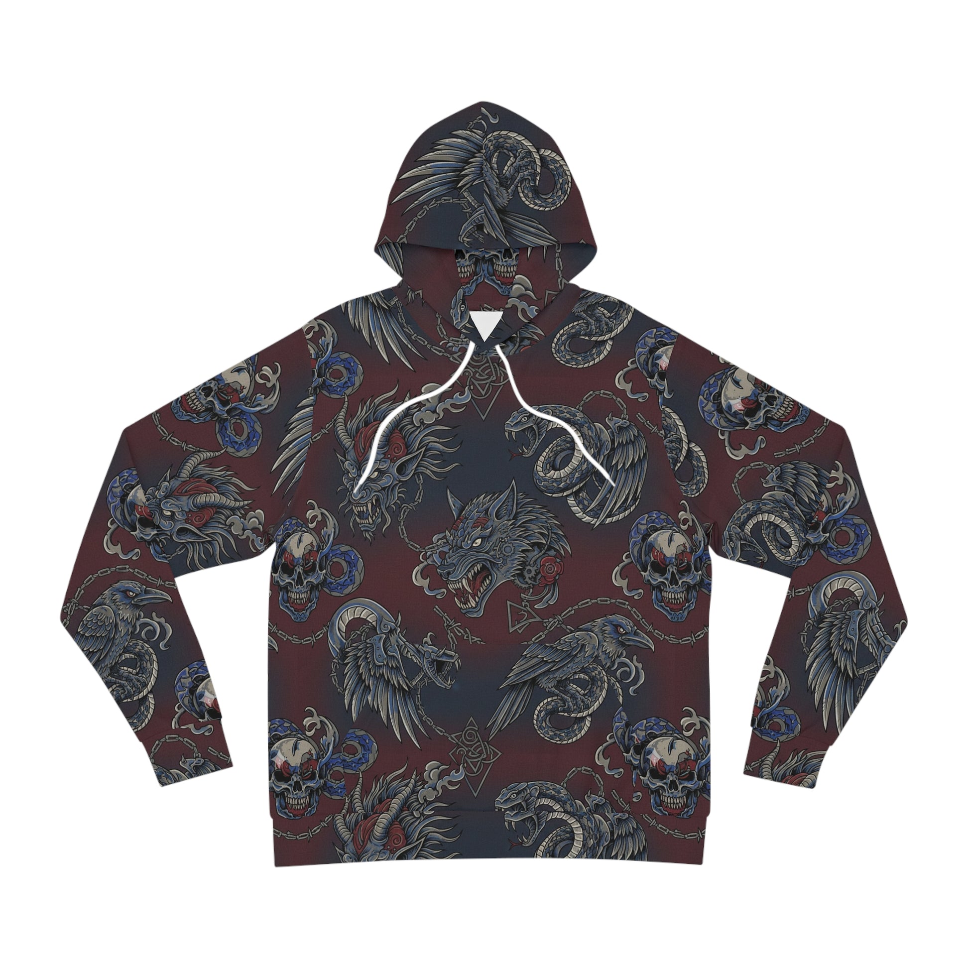 This hoodie wraps a raw, cinematic edge around your everyday layers. Deep, worn-maroon and charcoal tones host snarling wolf heads, coiled serpents, winged talons and weathered skull motifs — imagery that reads like a road-worn emblem from a biker’s leather jacket or a midnight tattoo flash. The medium-heavy knit feels substantial without being stiff, and the all-over print keeps the design continuous across the hood, sleeves and pouch pocket. Wear it on cool evenings by the roadside diner, at late-night shows, or when you want a bold, solitary statement that looks lived-in and personal.