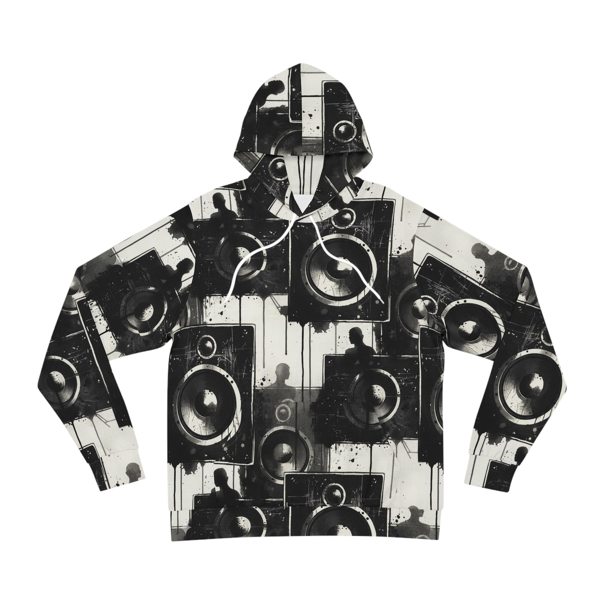 This hoodie speaks in basslines and midnight runs. A monochrome collage of stacked speakers and shadowed silhouettes wraps the whole garment for an all-over vibe that reads like a mixtape cover. Slip it on and you feel the room tighten around a beat: close, raw, alive. The hood sits low when you want to disappear into the music; the kangaroo pocket holds your phone and your hands between sets. Built from a sturdy, slightly heavy fabric that prints with crisp contrast, it wears well through late nights, street sets, and slow Sundays spent digging for records. This is for people who live for sound — DJ crates, underground shows, late-night studio sessions — and want clothing that carries that energy without shouting. It pairs cleanly with worn denim, high-tops, or layered under a long coat for winter shows and urban nights out.