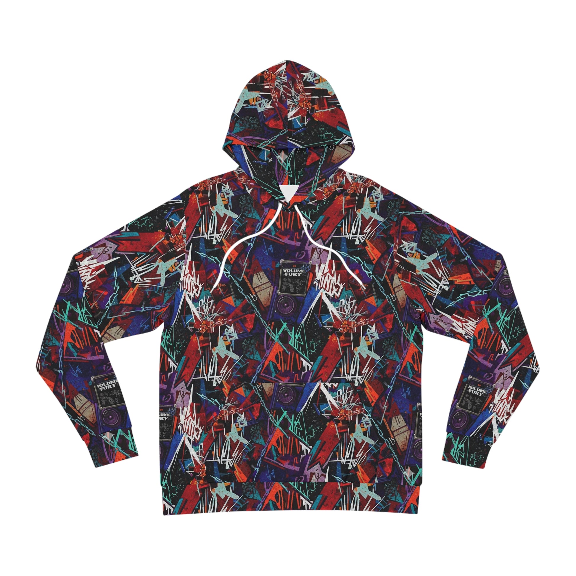 This hooded all-over-print piece feels like stepping into a neon-soaked night — chaotic, electric, and unapologetically bold. The collage of jagged graffiti strokes, geometric shards, and saturated reds, purples, and teal pulses across every inch, so the hood, sleeves and pocket become part of the artwork. It sits like a lightweight armor for street nights, late shows, and city wanderings; it keeps you warm at dusk without hiding the statement. Wear it with worn denim and boots, or layer under a long coat when the air turns sharp. The roomy kangaroo pocket and adjustable hood make it easy to move through crowds or stand out on a corner. Built to hold color and shape, it keeps the print vivid on the main panels while showing subtle texture where the fabric naturally wears. For those who live for city energy, this hoodie reads like a personal billboard — loud, layered, and alive.
