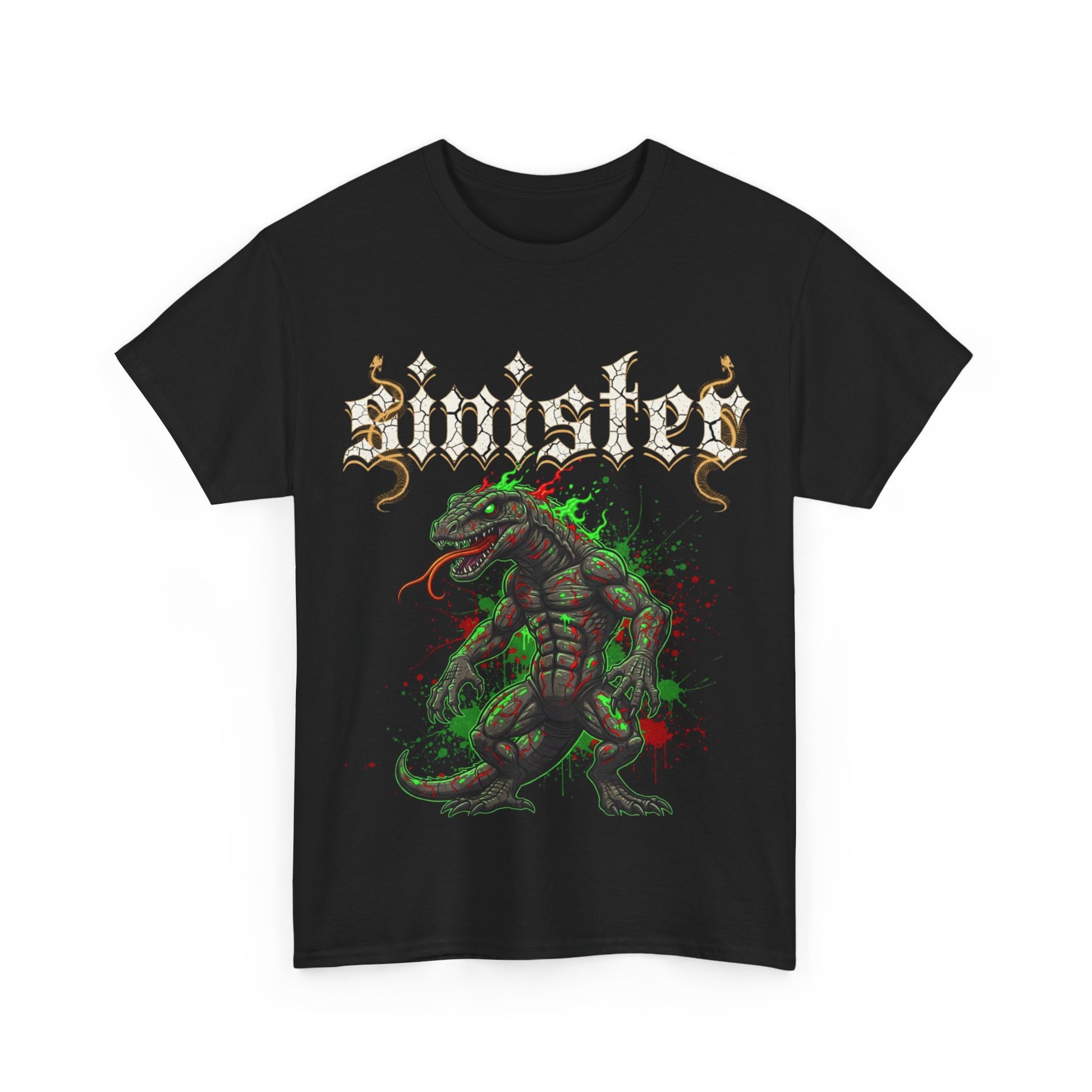 This black cotton tee wears attitude. A snarling, reptilian warrior coils across the chest in toxic greens and splashes of crimson, while the jagged, gothic wordmark above hisses with old‑school metal energy. It feels like a late‑night mosh pit, neon stage smoke, and the exhilaration of a track that hits too hard — worn by someone who likes to make their presence known without saying much. The fit sits relaxed at the shoulders and torso, so it layers easily under a leather jacket or stands alone with ripped jeans. The fabric holds bright, detailed prints and keeps its shape through wash after wash. Put it on when you want to lean into raw edge and let the design do the talking.
