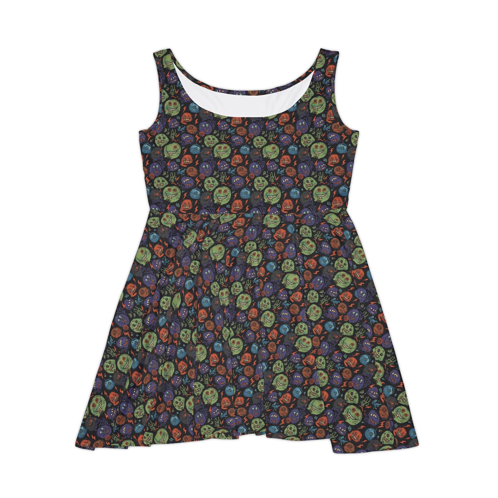 This mid-length skater dress brings playful, darkly whimsical energy to casual and dress-up wardrobes. The lightweight-yet-structured polyester-spandex blend skims the body with comfortable stretch, while the high-cut neckline and fitted waist open to a swaying asymmetrical skirt. All-over jewel-toned skull motifs create a mood that’s equal parts mischievous and vintage-rock — imagine late-night record shopping, lantern-lit alleyway walks, or a cozy autumn market. Durable double-needle stitching and vivid dye-sublimated colors ensure the print stays crisp through wear. Layer with a leather jacket and boots for an edgy evening, or pair with sneakers and a denim vest for daytime wandering. Assembled in the USA from global parts, this dress is built to move with you and keep its character season after season.