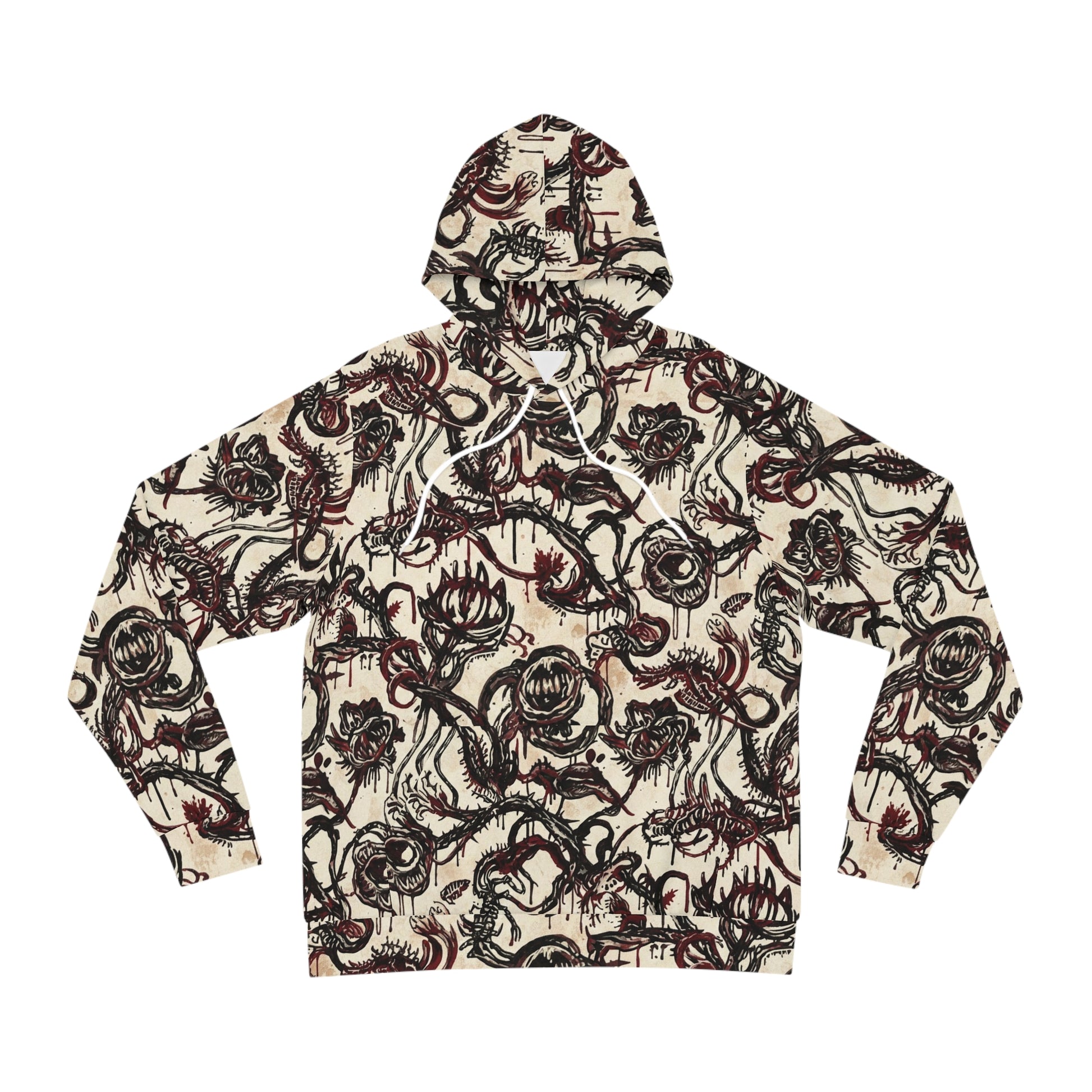 This hoodie wears like a sketchbook come to life — raw, restless, and full of motion. Inked vines and thorned blooms crawl across the fabric in charcoal and blood-red strokes, creating a statement that’s equal parts art and attitude. The medium-heavy knit drapes comfortably, while the roomy hood and kangaroo pocket make it easy to pull on between studio sessions or late-night walks. It’s for people who prefer their wardrobe with a story: messy lines, faded edges, and the kind of grit that ages well. Let it be the layer you reach for when you want to feel wrapped in something bold, thoughtful, and a little wild.