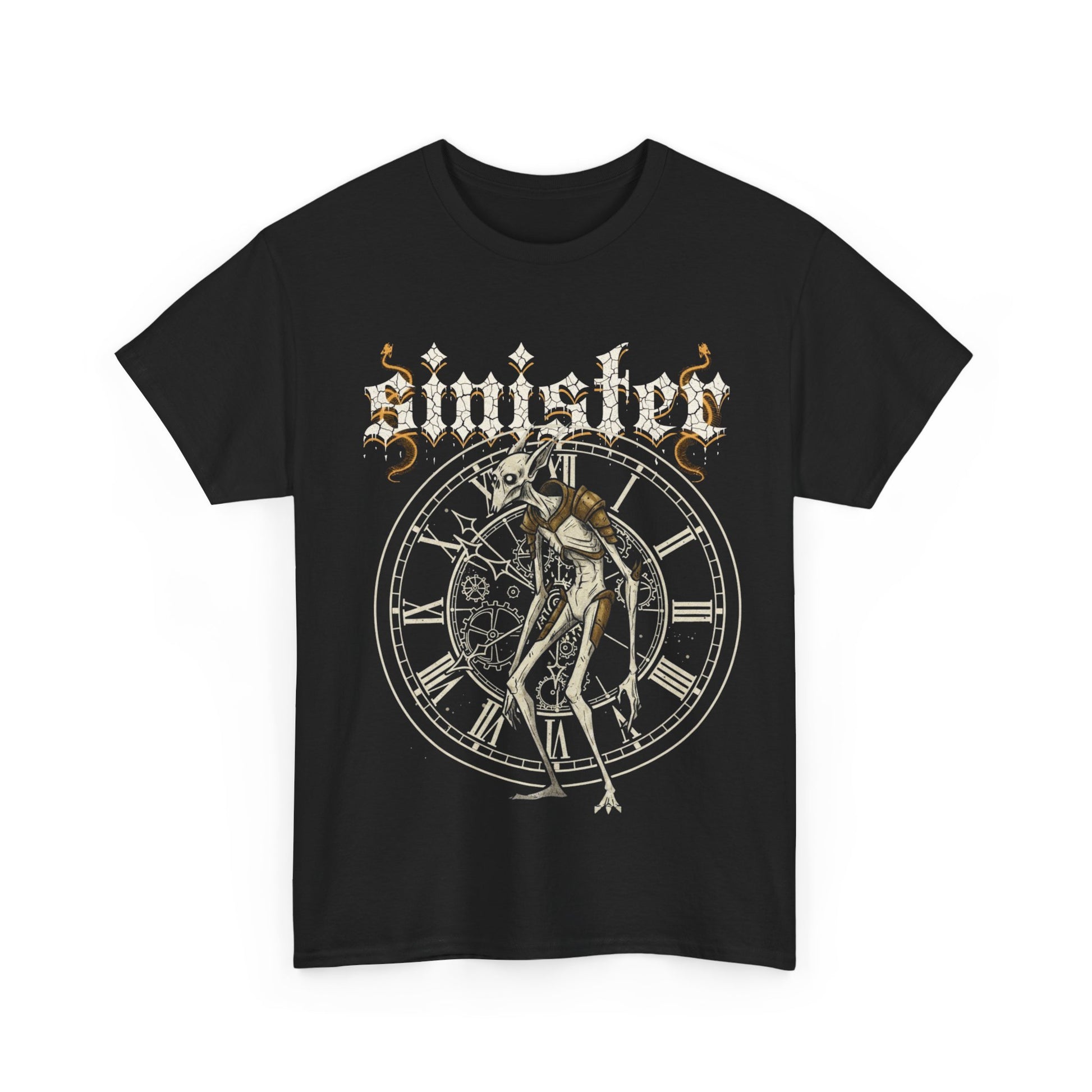 This tee carries a dark, vintage-heavy vibe: a bold clockface backdrop, a skeletal dancer caught mid-motion, and distressed gothic lettering that reads like a whisper from an old tour poster. It settles into the wardrobe as a statement layer — worn alone with black jeans, under a worn denim jacket, or layered for colder nights. The print’s muted creams and golds age like oxidized brass, so every wear feels lived-in and cinematic. It’s for nights at the bar with friends who collect vinyl, for late drives with the radio low, and for the person who likes their style edged, storied, and slightly theatrical.