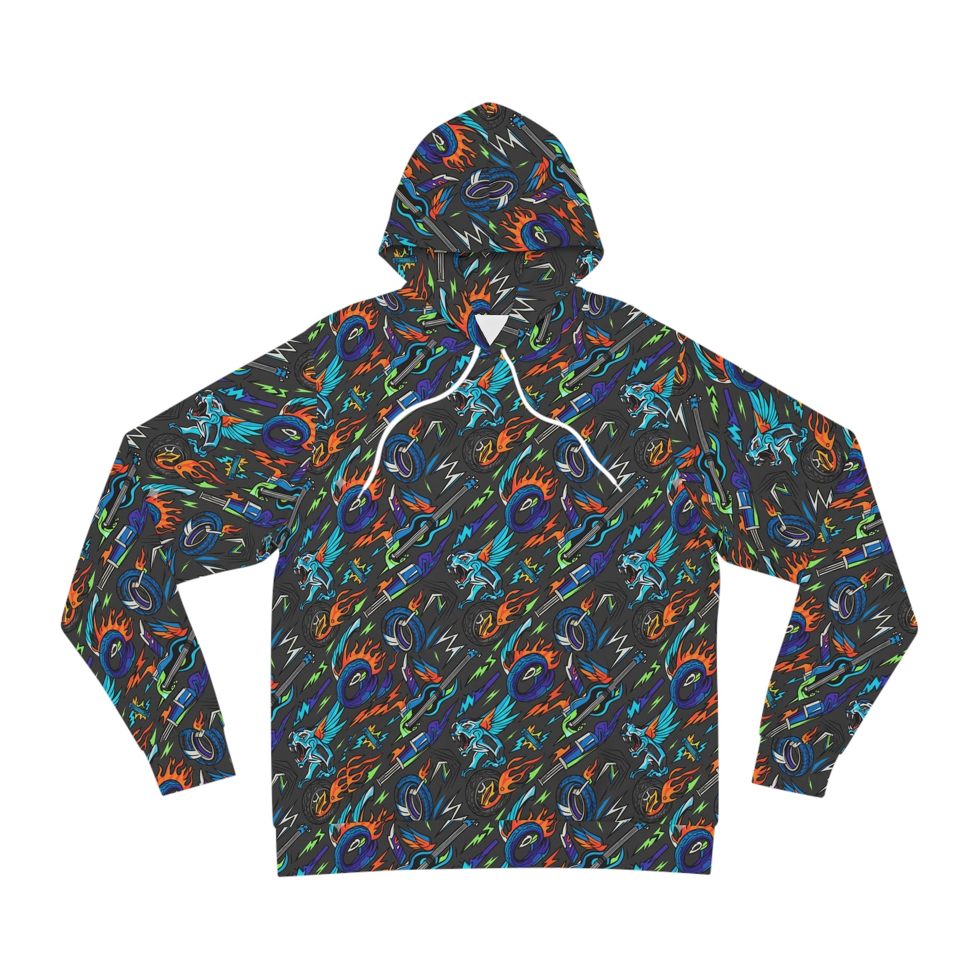 Slide into this all-over-print hoodie and let the riot of color do the talking. The pattern feels like an urban mural—bold swathes of teal, cobalt, rust and ember dancing across a charcoal ground. It wears like a statement piece for days when you want energy without shouting. The fit is relaxed and unisex, with a roomy kangaroo pocket for chilly hands and a drawstring hood that tucks into the composition of the print. The medium-heavy fabric holds the print’s texture and drape, so the artwork stays vivid across movement. Bring it to late-night walks, gallery hops, or coffee runs when you want to feel seen and comfortably wrapped in color.
