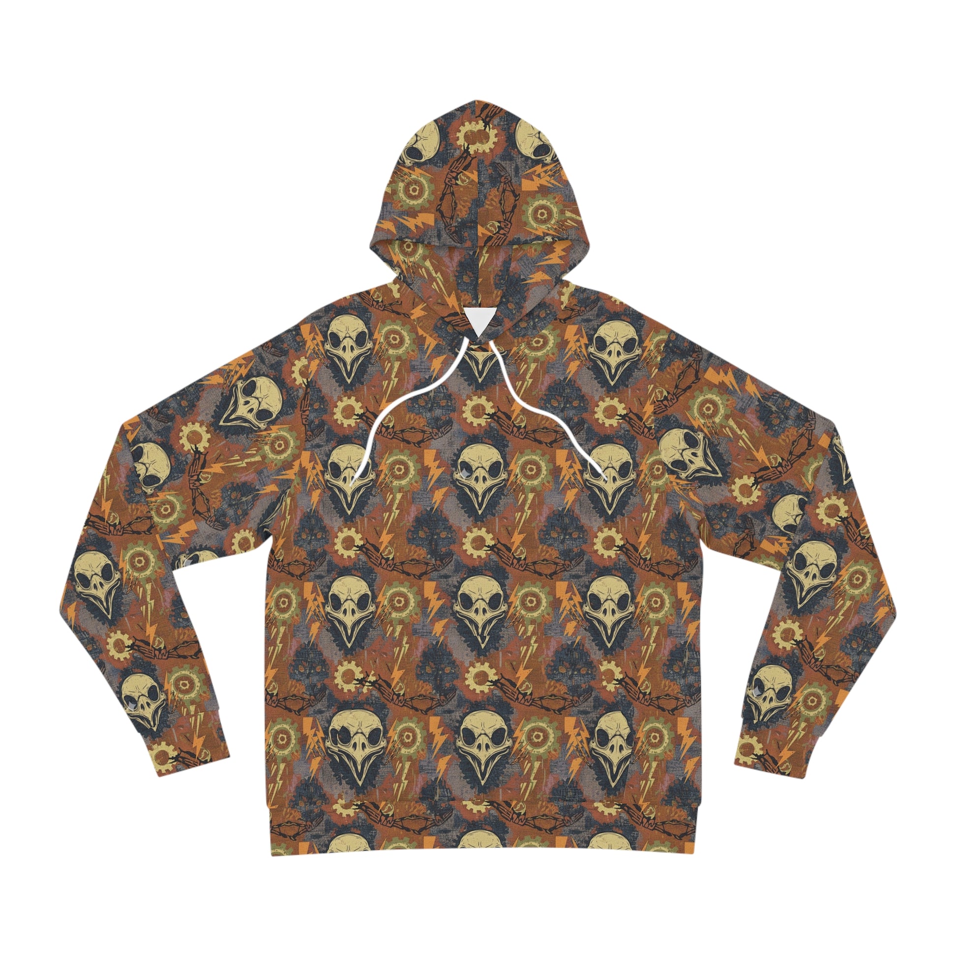 This pullover hoodie brings an artful edge to streetwear with an all-over print of vintage skulls, crow beaks and sunburst motifs in warm autumn tones. The medium-heavy fabric drapes comfortably while keeping its shape, and the roomy kangaroo pocket and adjustable hood add everyday practicality. It wears like a statement piece — layered over a tee on crisp mornings or thrown on for late-night walks — for people who like their wardrobe to feel a little mysterious and hand-crafted. Colors are warm ochre, rust and deep slate; printed details have a slightly muted, textured look that reads like an aged poster.