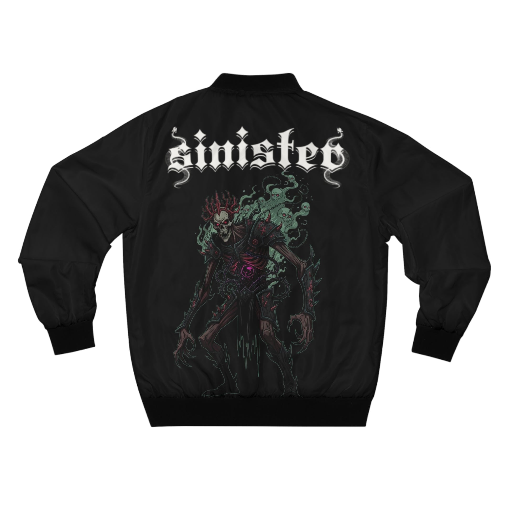 A midnight-black bomber that wears like attitude. The lightweight polyester shell keeps a crisp silhouette while the dark blue lining and rib knit cuffs give it a classic bomber feel. On the chest, a small, old-English “sinister” wordmark whispers intent. The back erupts with a moody, horror-inspired illustration—smoky green spectral tendrils, a twisted, wounded figure, and sharp gothic lettering—so the jacket reads like a page ripped from a dark fantasy comic. Wear it to late-night shows, urban walks that skirt the old part of town, or when you want your outer layer to say more than small talk. It layers easily over hoodies or tees and moves with you thanks to the full metal zipper and roomy cut. Built for those who like their style heavy on atmosphere and low on compromise.