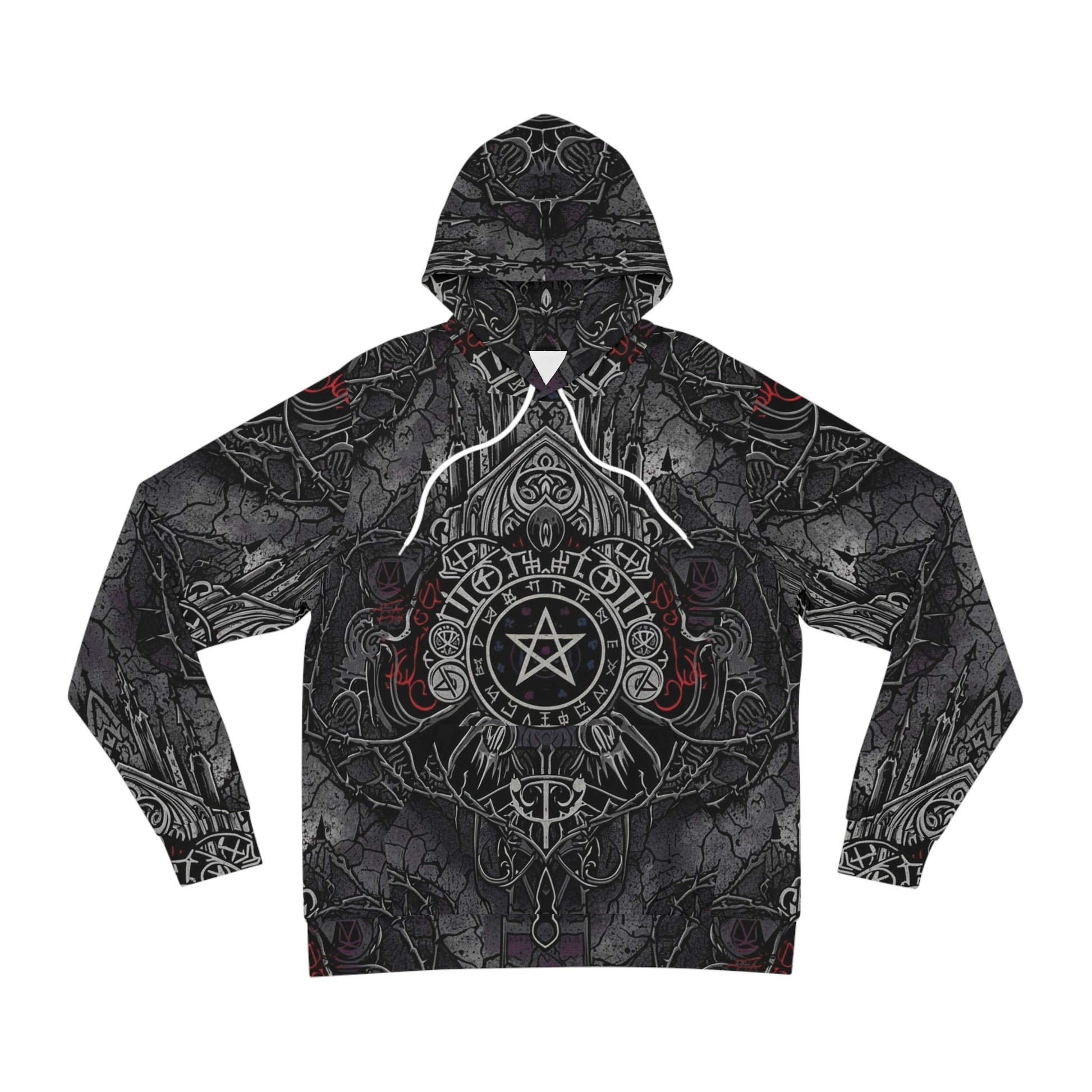 This dark, all-over printed hoodie wraps you in a brooding, gothic atmosphere—like stepping into a rain-slick alley behind an old cathedral. Intricate sigils and a central pentagram motif are layered over cracked stone texture and subtle blood-red accents. The result feels ritualistic and urban: worn by someone who moves through late-night streets, collects obscure vinyl, and reads by candlelight. The hood pulls up for quiet focus; the roomy kangaroo pocket warms your hands and holds small treasures. Built from a sturdy polyester-blend that prints detail sharply, this hoodie keeps its shape and the design’s depth through regular wear. It’s for nights at underground shows, midnight walks, or adding a moody anchor to your everyday look.