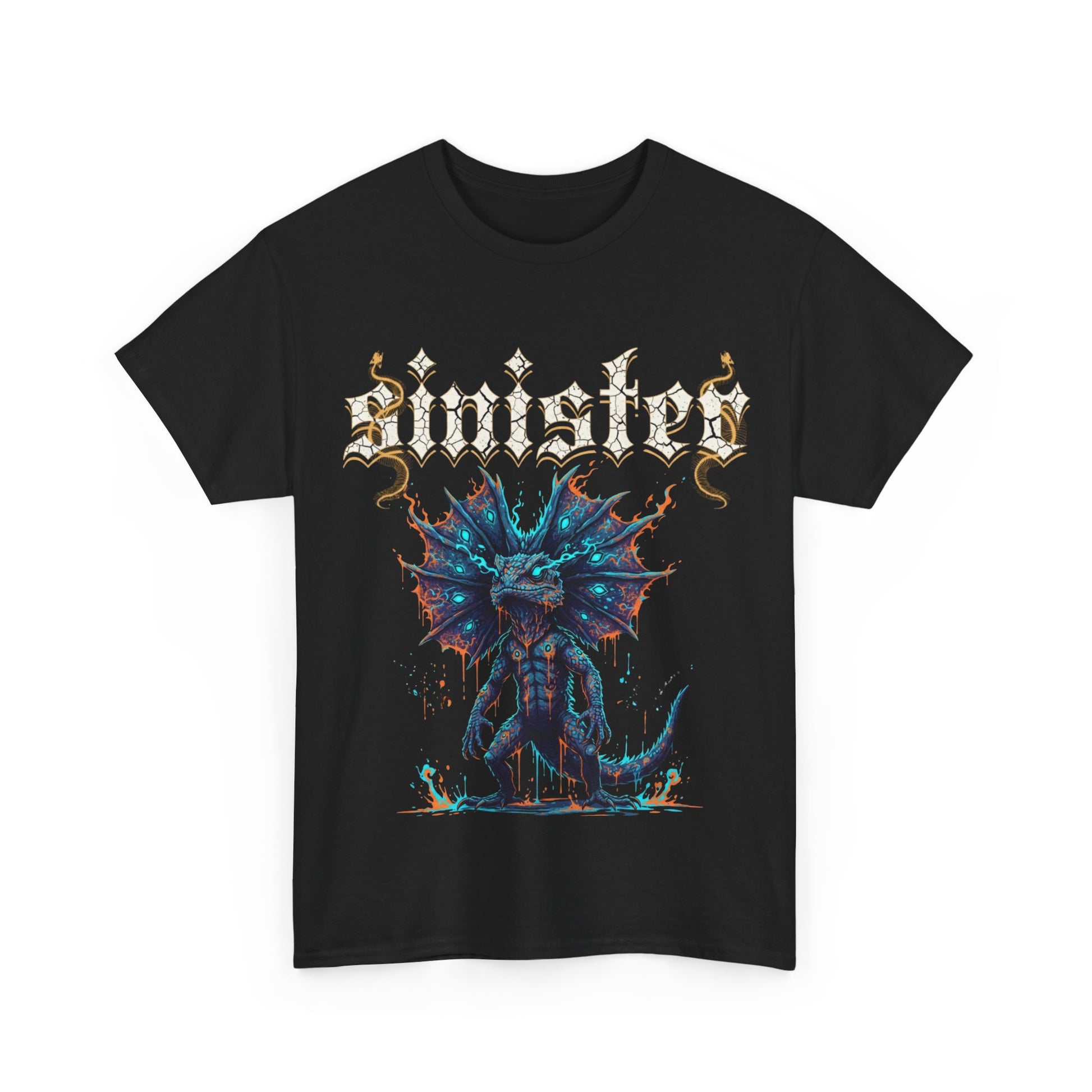 A bold, dark tee that channels late-night mosh pits and underground art shows. The shirt features a striking, neon-infused creature illustration under a jagged, gothic wordmark — vivid blues and molten golds pop against deep black. Wear it to show allegiance to heavy music, uncanny art, and the thrill of the unknown. The fit is relaxed and familiar, so the design sits like a banner across the chest without feeling tight or precious. This is for people who live for basslines, sketchbook margins, and midnight gallery crawls — a wearable piece of attitude that looks as at-home onstage as it does layered under a denim jacket on the way out the door.