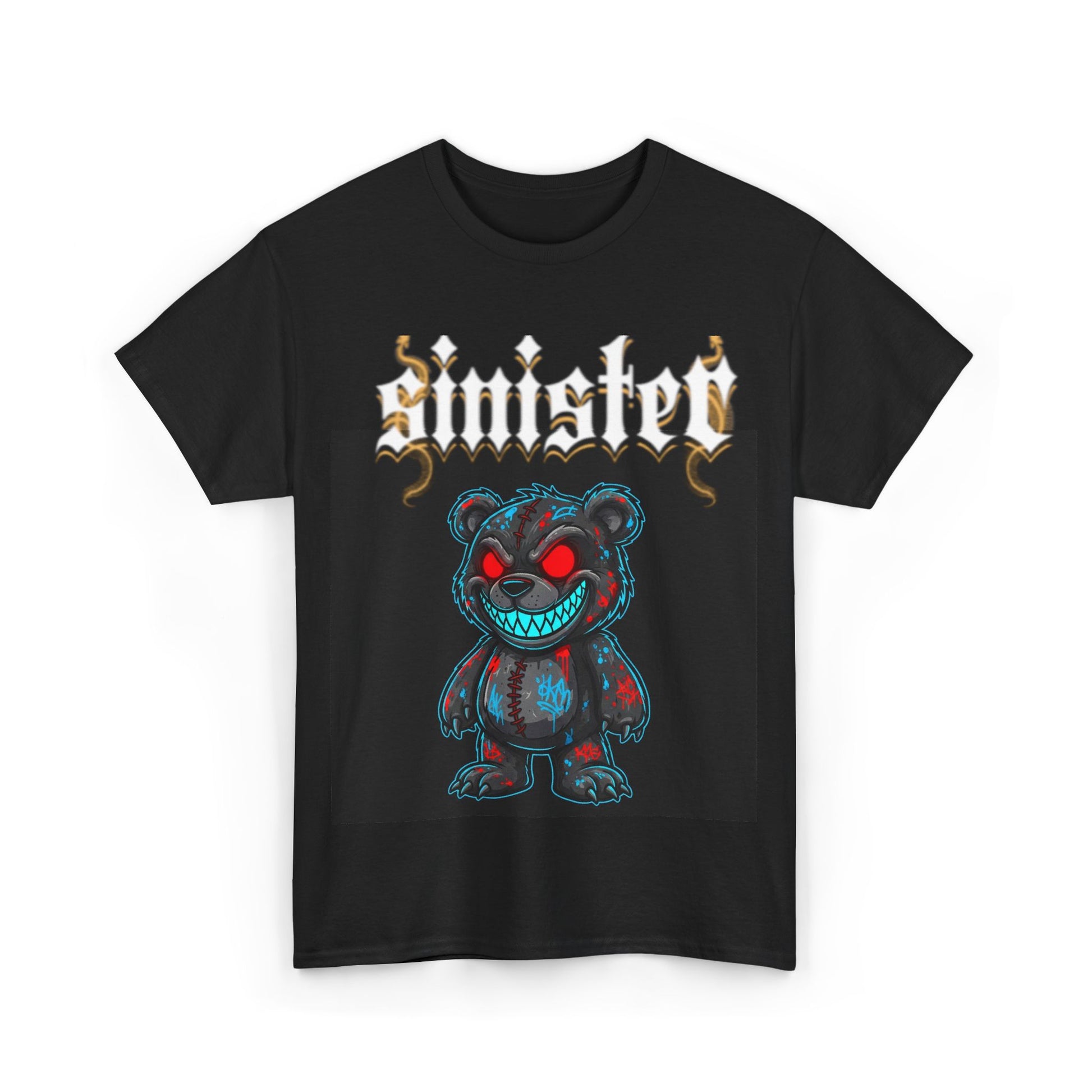 Night-street energy wrapped in a soft, reliable tee. This classic crew-neck shirt carries a bold graphic: a grinning, sinister teddy bear rendered in vivid blues and blood-red highlights under an ornate “sinister” wordmark. It reads like a midnight anthem — edgy and a little playful — that slips easily into everyday wear. The medium-weight cotton drape and relaxed cut make it comfortable for long nights out, skate sessions, or layering beneath a worn denim jacket. Washed black keeps the artwork striking and lets the details pop without shouting. Wear it when you want to feel a little dangerous and a lot of yourself.