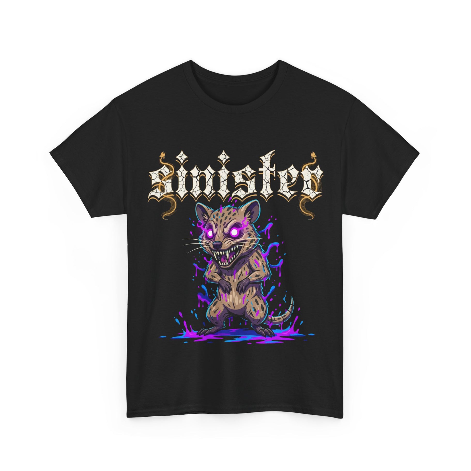 This black cotton tee brings a bold, atmospheric edge to everyday wear. A neon-infused, mischievous creature prowls the front—glowing purples and electric blues cut through the dark fabric while ornate, gothic lettering crowns the design. The shirt’s relaxed, classic cut and smooth print give it a lived-in look that pairs naturally with worn denim, layered hoodies, or stage-ready outerwear. It’s made to be worn loud: for nights out, underground shows, or when you want your look to lean toward the mysterious and expressive. The scent of late-night streets and pulsing venues feels woven into the design—raw, energetic, and unapologetically bold.