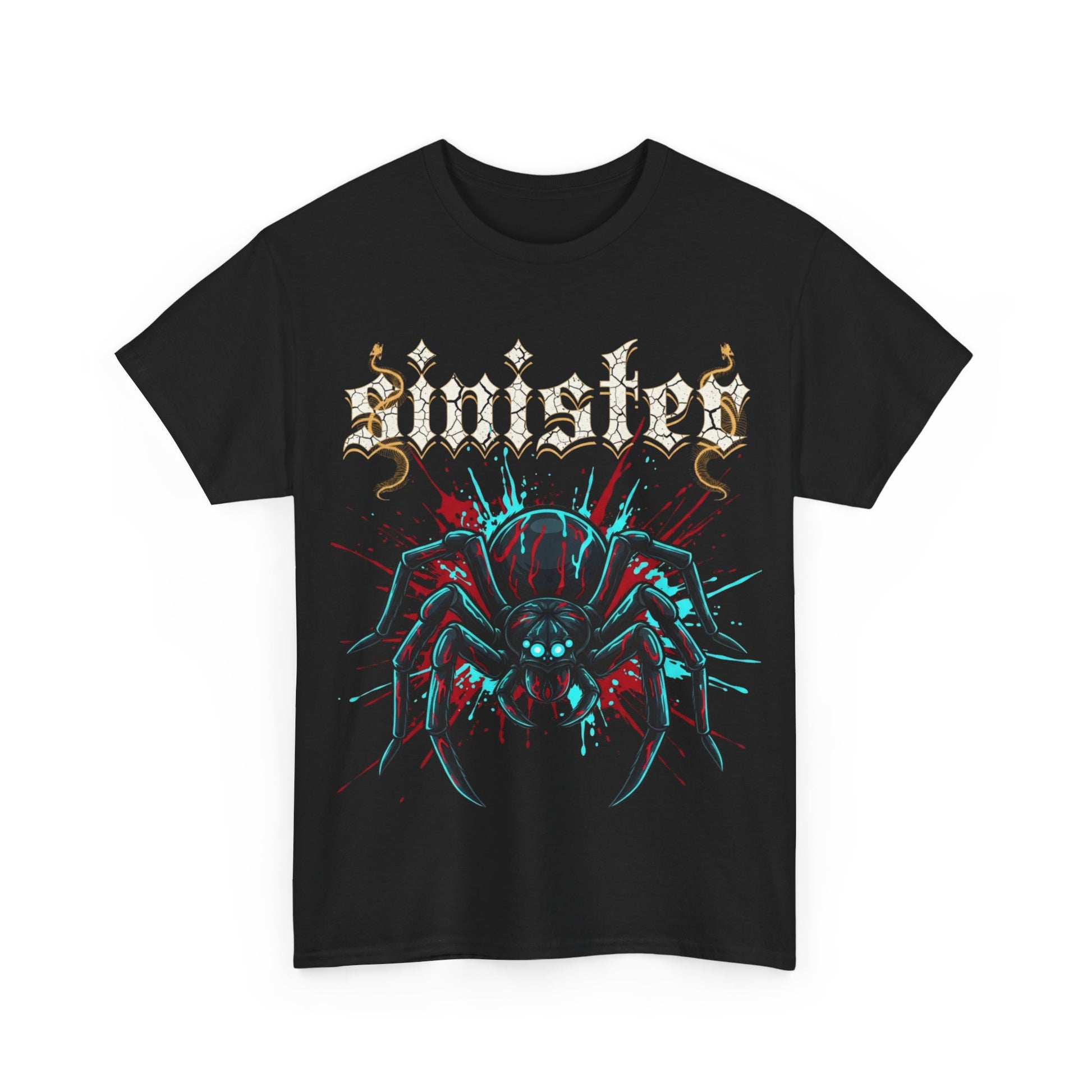 A dark, statement tee that channels heavy-hitting, underground vibes. The bold front graphic — a menacing spider rendered in neon teal and blood-red with distressed, gothic lettering above — feels like loud music poured into fabric. Wear it to shows, late-night hangs, or when you want your look to say ‘don’t mess with me’ without a word. The medium-weight cotton drapes with a classic, relaxed fit and a clean crew neckline, letting the artwork take center stage while staying comfortable all evening. It ages well, keeps its shape, and the tear-away label means you won’t get distracted by itch or scratch. This shirt fits into a wardrobe of leather, ripped denim, and well-worn boots — a piece that adds attitude to routines and amplifies the energy of any night out.