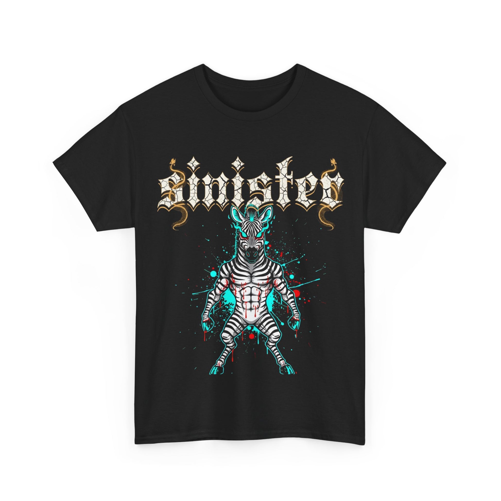 This black cotton tee wears attitude on its chest. A bold, ink-bright graphic of a striped, otherworldly creature bursts in teal and white under an ornate, gothic wordmark — the design feels like a midnight alleyway show poster, equal parts snarling and surreal. The classic crew neck and relaxed silhouette let the art take center stage while keeping everyday comfort. Slip it on for late-night gigs, record-store runs, or when you want your look to read loud without saying a word.