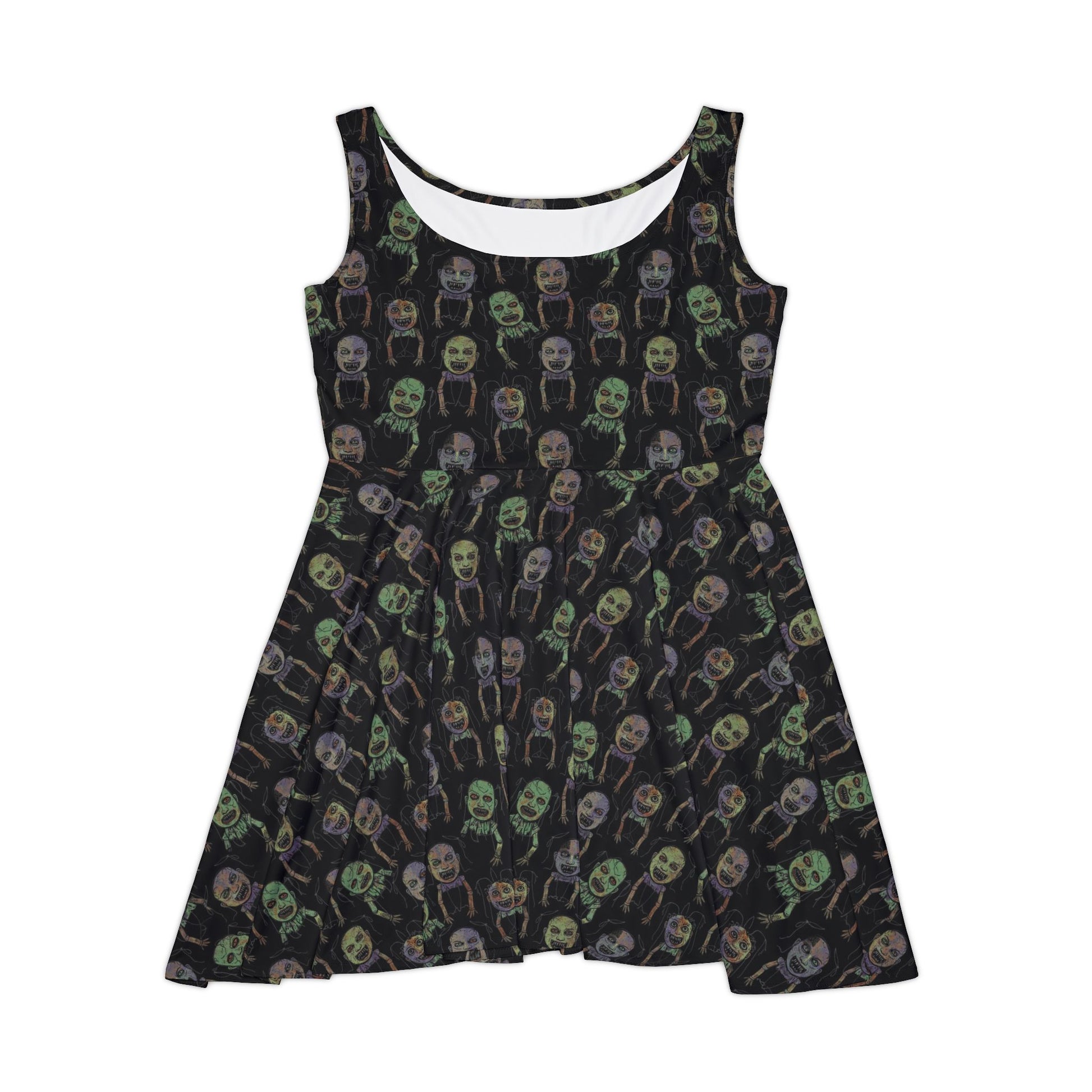 A playful, slightly spooky skater dress with an all-over pattern of stylized skulls in muted greens and grays on a deep black background. The mid-length, asymmetric skirt moves with soft drama, while the high scoop neckline and fitted bodice keep the silhouette fresh and wearable. Lightweight stretch fabric hugs comfortably yet allows easy movement — great for nights out at a themed gathering, casual fall strolls, or layering with tights and boots when the weather cools. The print sits across the whole dress for a bold, wearable statement that leans gothic without feeling heavy-handed.