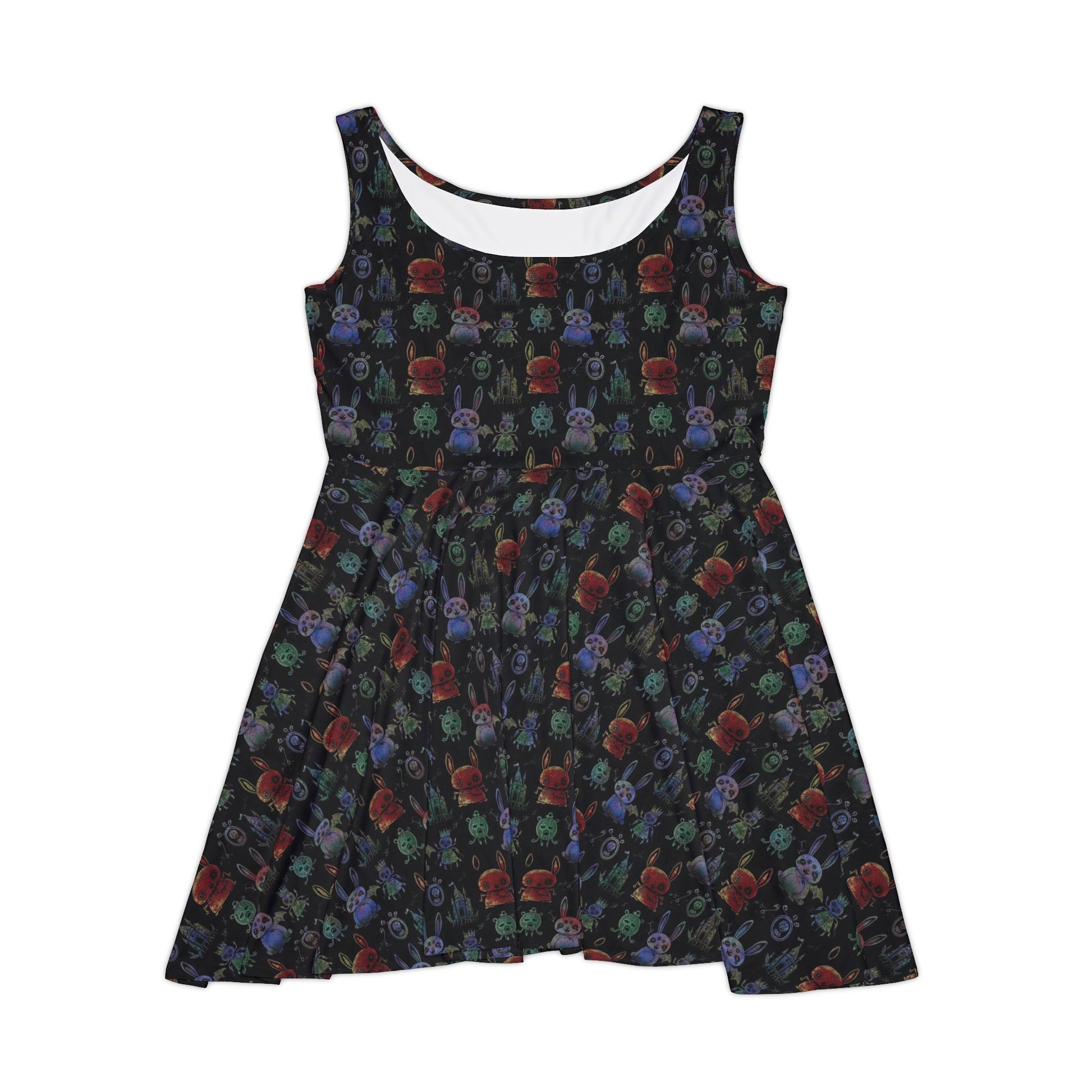 A playful mid-length skater dress with a dark, moody all-over print of small colorful floral motifs. The high scoop neckline and sleeveless cut keep the silhouette clean and wearable, while the asymmetrical skirting and gathered waist add movement that flares with each step. The fabric has a smooth, slightly stretchy hand that holds vivid colors and crisp detail, so the print stays rich against the black background. Wear it with boots and a leather jacket for evening walks, or layer a cardigan and tights for cool-weather markets — it moves easily from day to night and feels like a little wearable story every time you put it on.