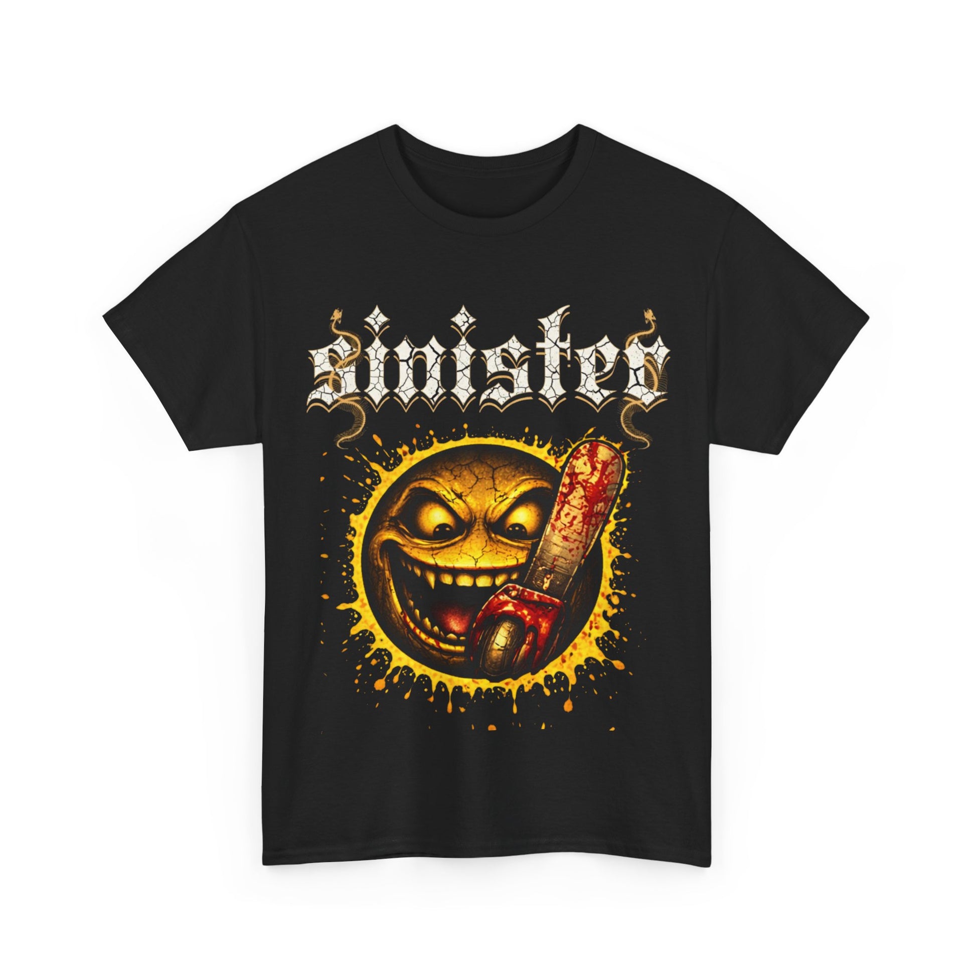 Black cotton tee stamped with a bold, gritty graphic — a snarling, dripping smiley clutching a bloodied popsicle beneath a jagged, metal-style “sinister” wordmark. The art reads like an underground band poster or a late-night skate deck: high-contrast golds and reds pop off a charcoal field, giving the shirt a raw, in-your-face energy. Wear it to shows, skate sessions, or nights out when you want an edge without saying a word. The medium-weight cotton holds print detail sharply and feels substantial on the body, while the classic crew silhouette keeps the attitude wearable every day.