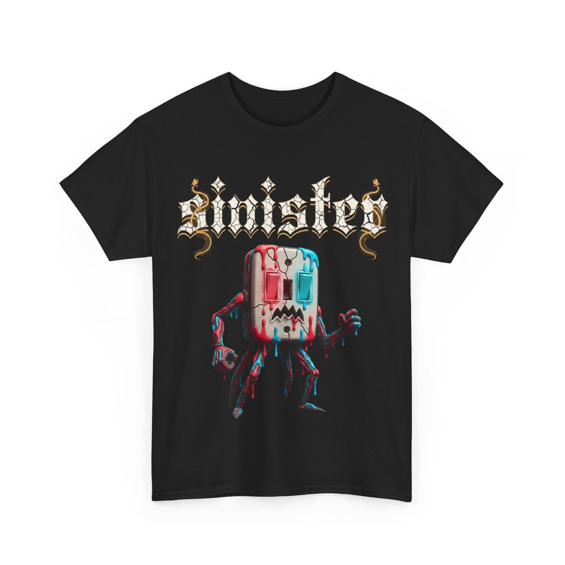 This black cotton tee carries a bold, slightly eerie vibe — a distressed gothic wordmark sits above a glitchy, blood-splattered character that looks equal parts marshmallow and marauder. Wear it when you want your look to feel like late-night skateboard sessions, underground shows, or wandering neon-lit streets. The medium-weight cotton holds sharp DTG and DTF prints so the gritty textures and metallic lettering stay vivid wash after wash. The relaxed, classic cut and ribbed collar make it easy to layer under a flannel or over a long-sleeve for cooler nights. It’s for people who lean into dark humor and offbeat art, who collect unusual pins, zines, and spare moments of strange joy.