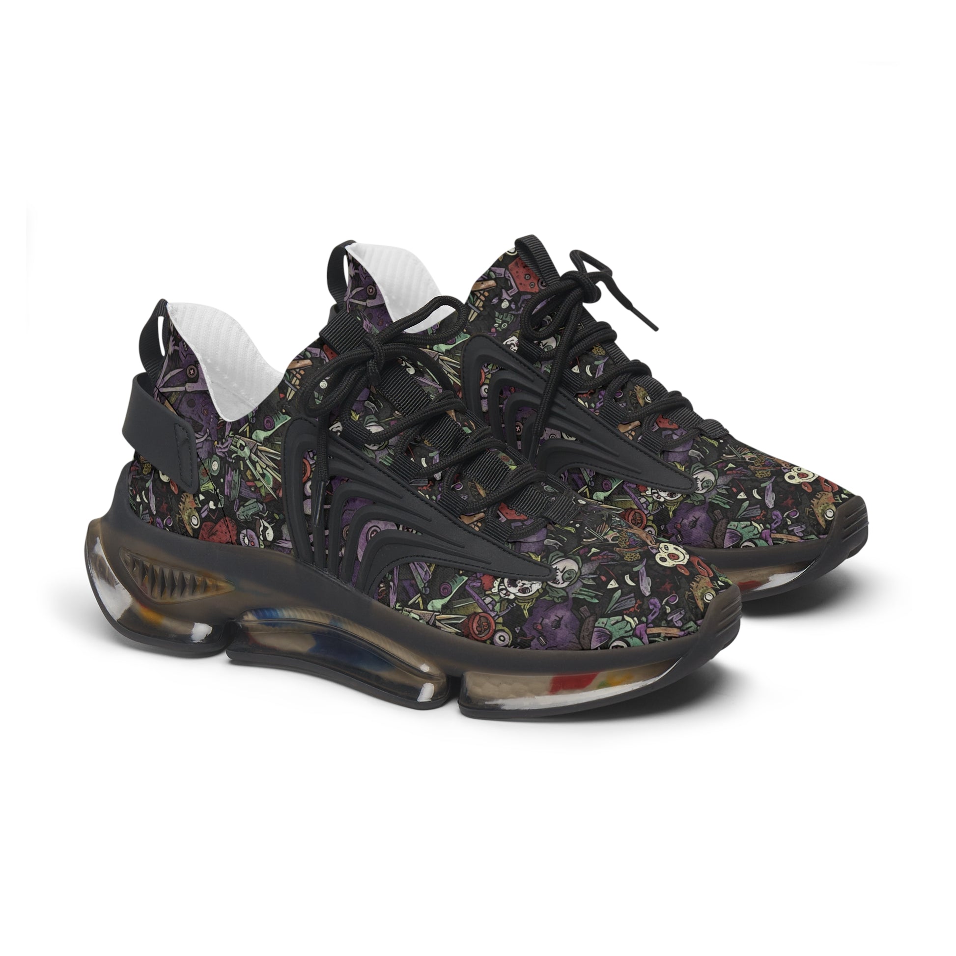 These mesh sneakers bring bold, moody art to everyday wear. Lightweight mesh knit lets your feet breathe while a deodorant memory foam insole cushions each step and wicks heat. The all-over print layers tiny skulls, roses and tangled vines in deep purples and muted greens, giving the shoes a darkly romantic, streetwise edge. KPU trims and a TPU/EVA sole with shock-absorbing EVA layer add weather-resistant structure and springy comfort. Lace-up styling and contrasting black or white detailing let you dial the look up or down—wear them for long city walks, late-night shows, or whenever you want a statement that’s equal parts tough and poetic.