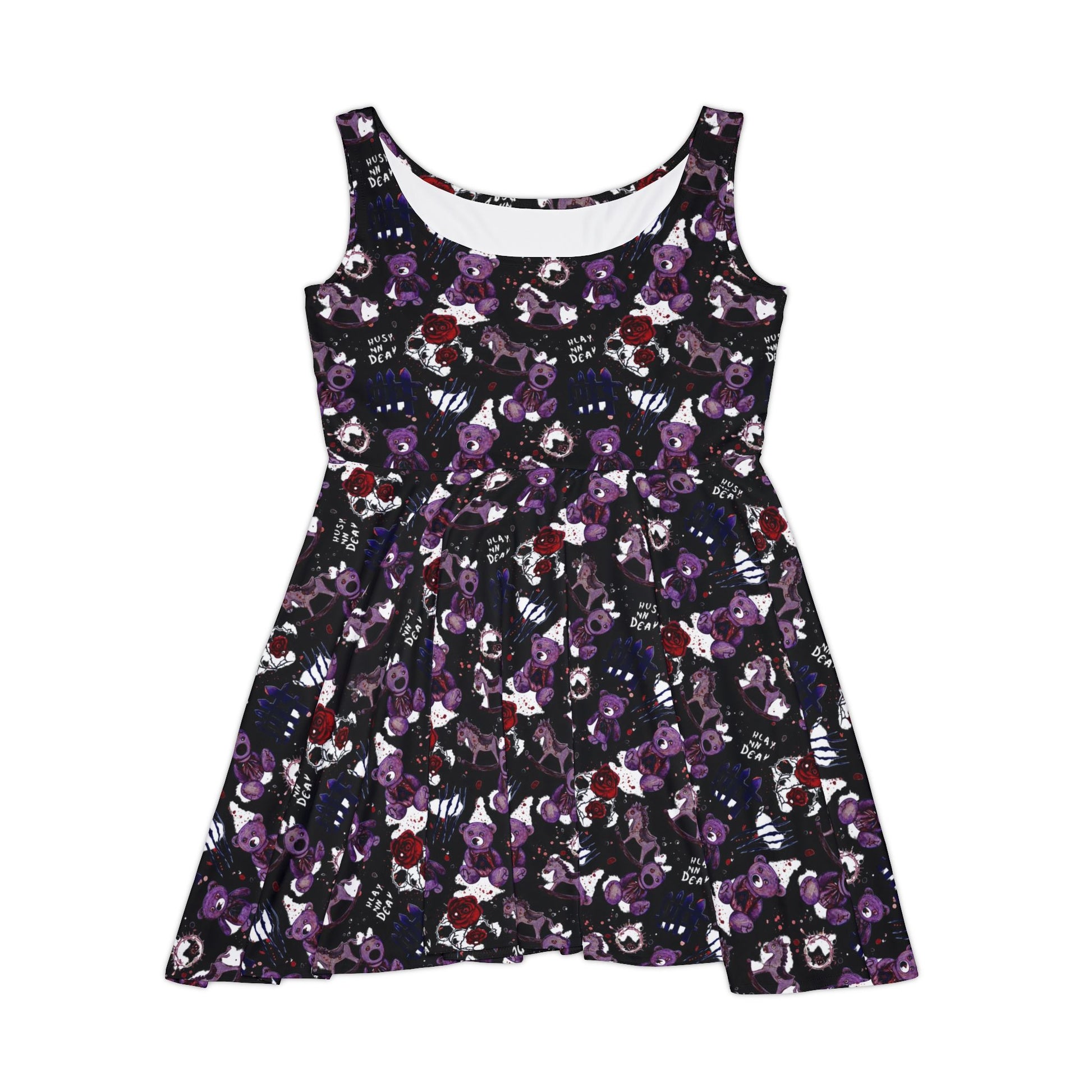 This mid-length skater dress carries a moody, playful energy—dark base tones peppered with rich purples and deeper reds create a floral-meets-noir print that feels both whimsical and a touch mysterious. The high-cut scoop neckline and fitted bodice lead into an asymmetrical, twirling skirt that moves with you—flatteringly flowy without being fussy. Stretchy polyester-spandex fabric keeps the print vivid and the fit comfortably close while allowing easy movement. Wear it with chunky boots and a leather jacket for city nights, or layer a cardigan and tights for quieter, creative afternoons. It’s for the person who likes a little drama in their wardrobe and wants clothing that can move from a gallery opening to a late-night coffee run with equal confidence.