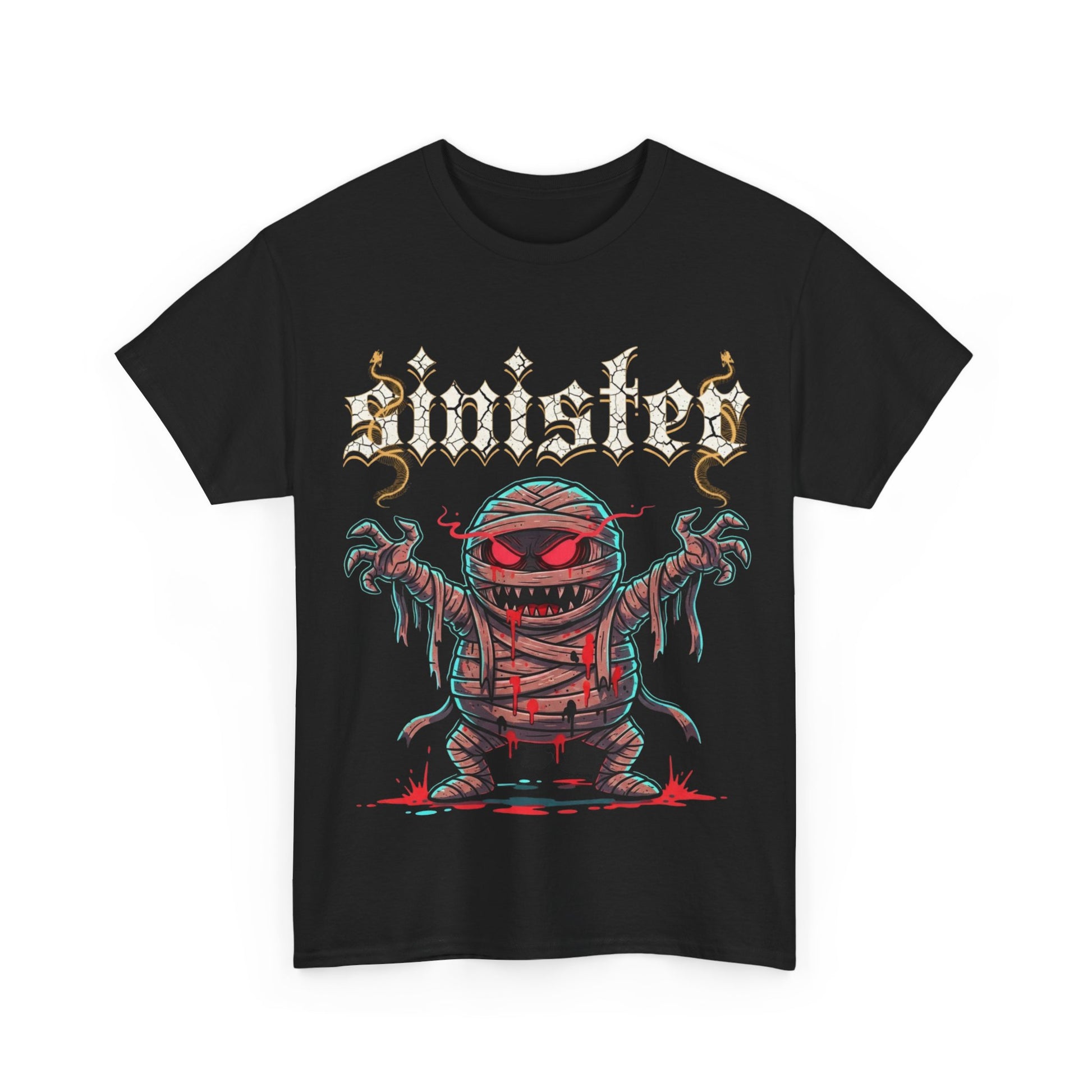 This black cotton tee brings playful horror to everyday wear. A cheeky cartoon mummy, wrapped in tattered bandages and glowing with neon highlights, stands beneath a gothic-style ‘sinister’ headline — it’s spooky without taking itself too seriously. The medium-weight fabric and classic crew silhouette make it comfortable for long nights at concerts, late-night sketching sessions, or casual hangouts. Wear it layered under a denim jacket or solo with ripped jeans to lean into a fun, dark aesthetic that reads like a nod to retro horror art and underground band merch.