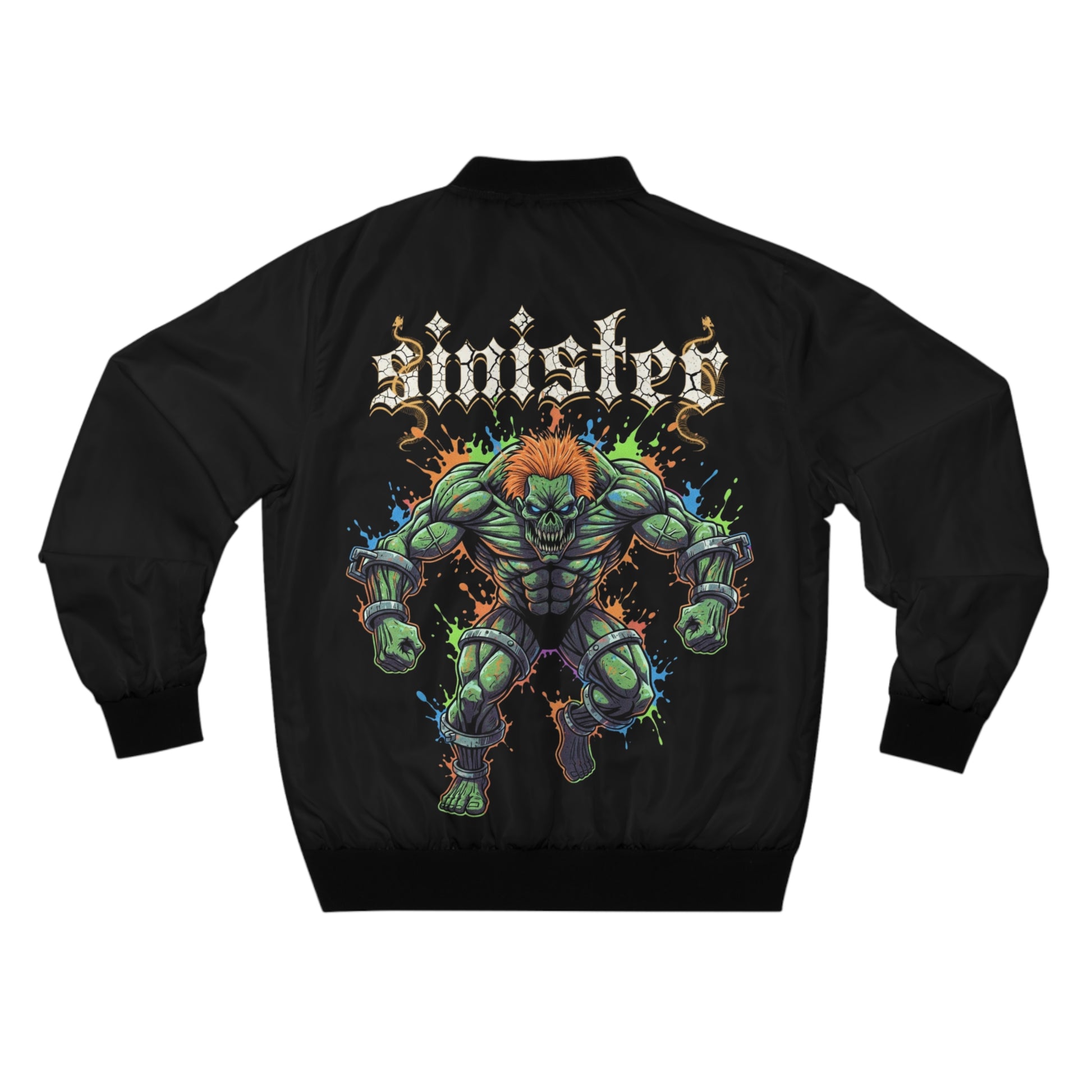 This heavyweight bomber jacket brings a bold, gritty energy to everyday wear. Built on a durable 100% polyester shell with a dark blue lining, it shields against wind and light rain without losing shape. The all-over-print back showcases a fierce, comic-inspired green muscle figure bursting forward beneath a stylized “sinister” wordmark — a statement graphic that reads like a band patch or vintage arcade poster. Black rib-knit cuffs, collar, and hem keep warmth in and give the jacket a classic silhouette, while the full metal zipper and two lined welt pockets add practical, street-ready function. Wear it to amp up a casual outfit, at shows and late-night hangs, or anytime you want an unapologetic, subcultural edge.
