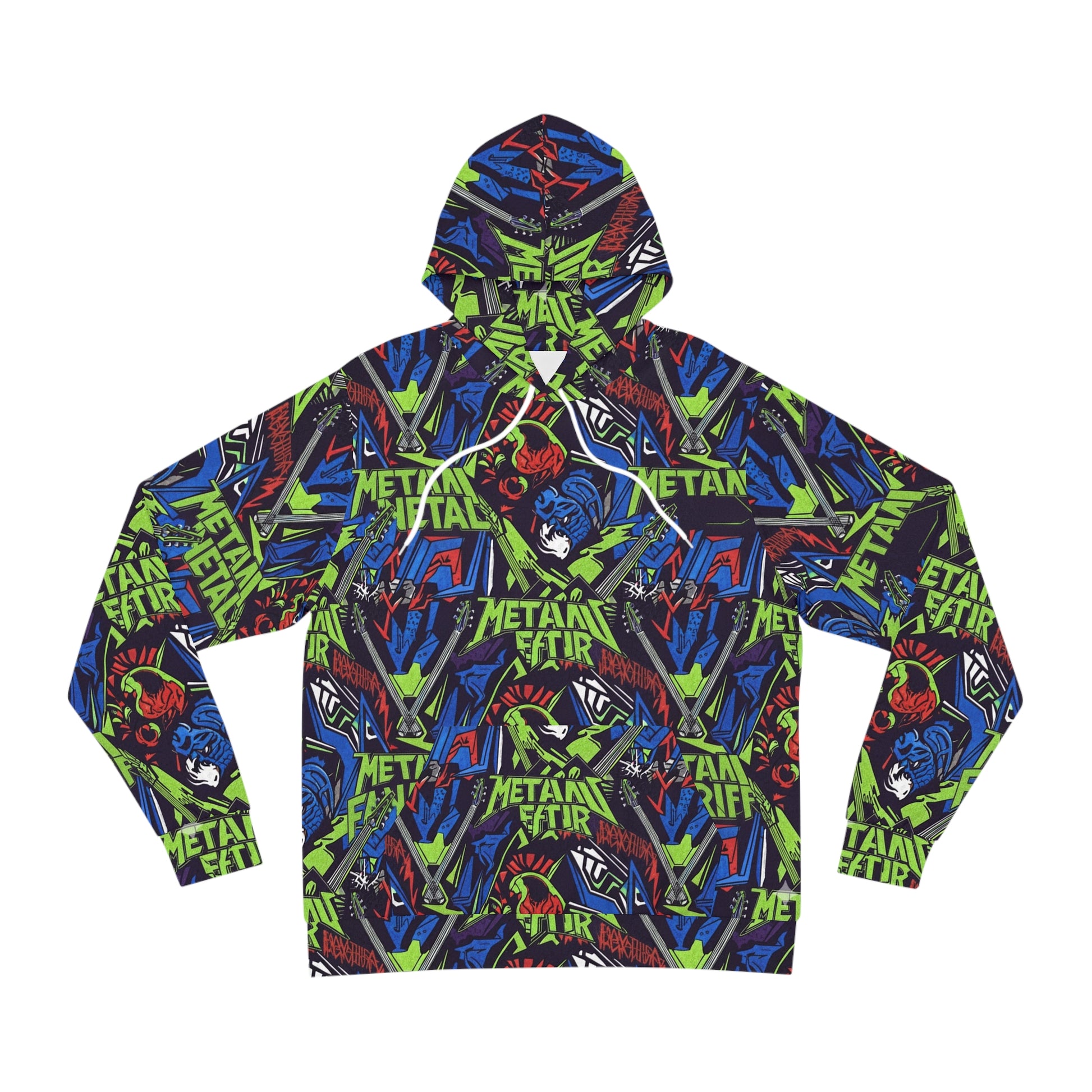 Crank the volume and slip into a hoodie that looks like it came straight from a vintage gig poster. Bold neon greens, electric blues and blood-red accents collide in an all-over print of snarling skulls, jagged typography and lightning flashes. The roomy kangaroo pocket and adjustable hood make it easy to head out for a late-night show, a long drive with the windows down, or a basement rehearsal. It wears like a heavyweight street piece but moves with a bit of stretch, so it keeps up with crowd-surfing energy or just lounging on a crate of records. This is for people who collect riffs, vinyl sleeves and adrenaline—an everyday armor that says you live loud and color outside the lines.