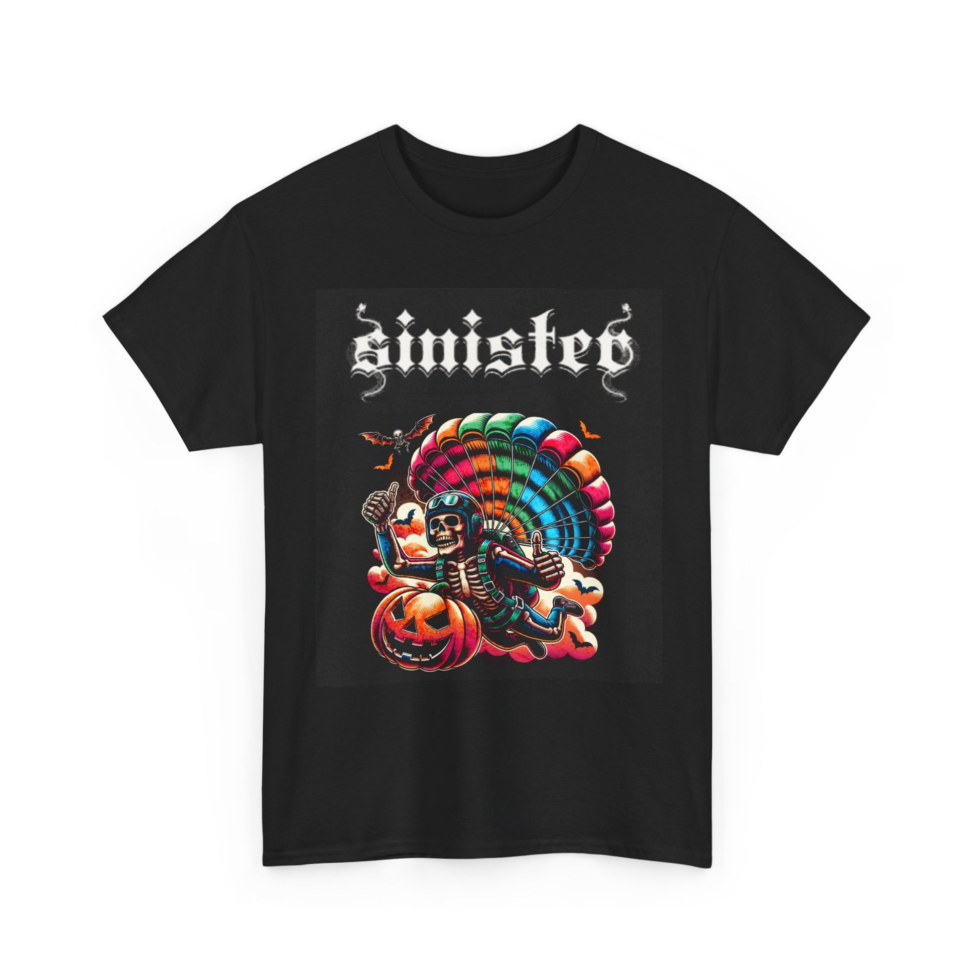 This classic crewneck tee carries bold, vintage-inspired artwork that blends dark humor with vibrant color. A dancing skeleton atop a rainbow-feathered turkey and grinning jack-o’-lantern create a kitschy, slightly sinister tableau that reads like a midnight carnival poster. The print’s textured details pop on the solid black fabric, giving the image depth while the relaxed silhouette keeps the shirt wearable every day. Wear it to add a playful, offbeat edge to your fall wardrobe or to mix spooky and cheeky aesthetics at seasonal gatherings.