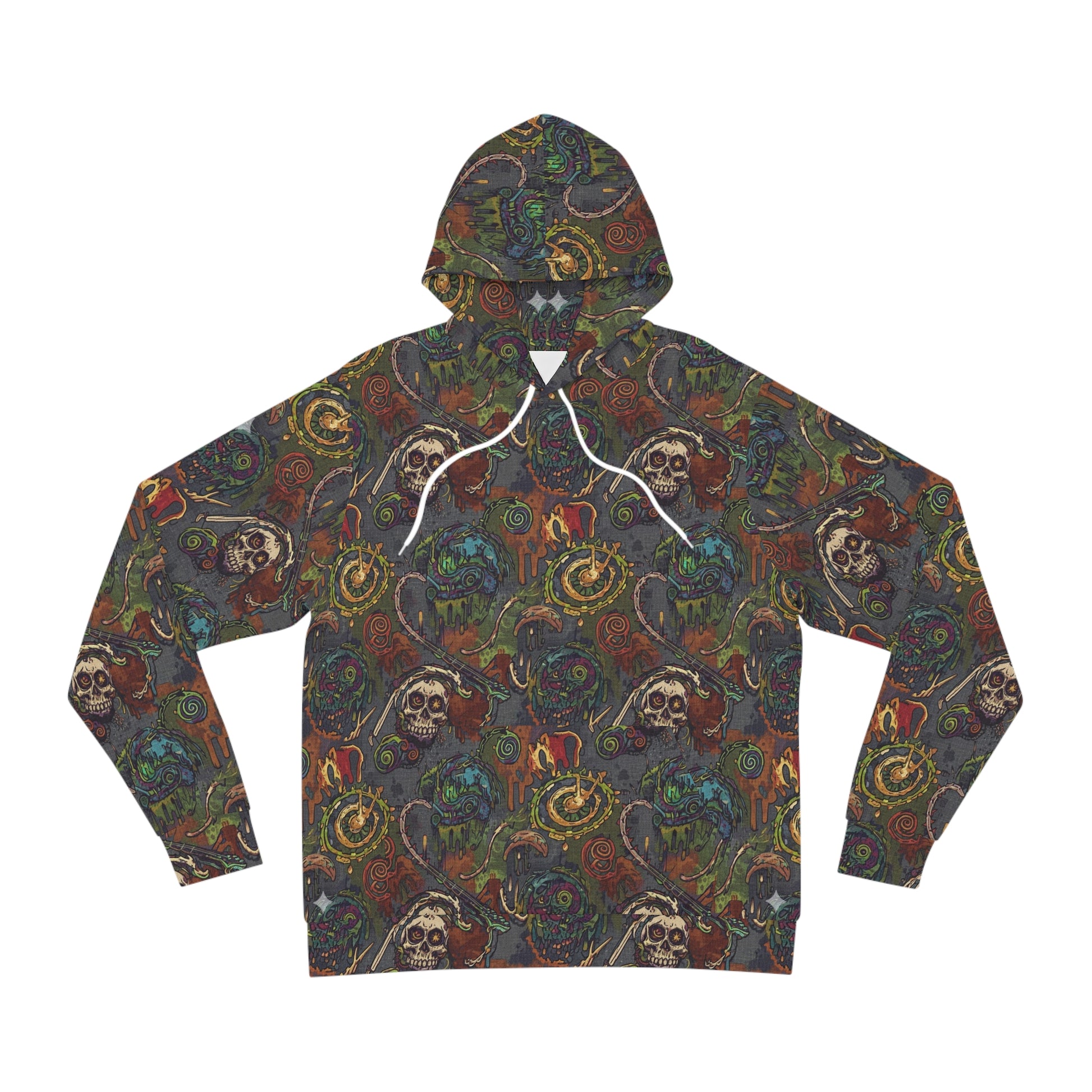 This printed hoodie wraps you in a moody, artful world — rich jewel tones, swirling symbols, and weathered skull motifs come together in a dense all-over pattern that feels like a page torn from a dark folk tapestry. The medium-weight fabric has a smooth, durable hand that holds the print’s painterly details without feeling bulky. Wear it on late-night walks, at basement shows, or when you want an easy layer that reads like a statement piece. The roomy kangaroo pocket and adjustable hood make it practical; the layered imagery invites quiet stares and conversation. It’s for people who lean into the strange and beautiful — collectors of vintage curios, underground art lovers, and anyone who prefers garments with personality and stories stitched into them.