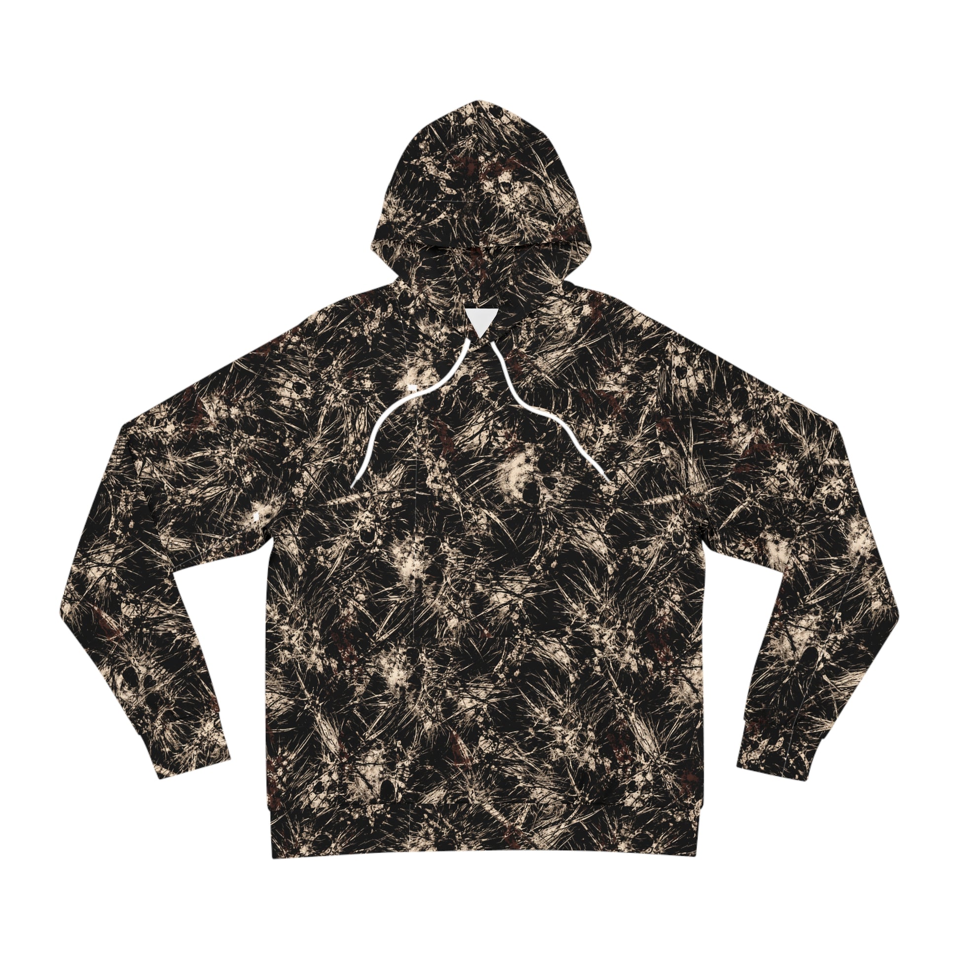 This hoodie wraps you in a raw, grounded energy — like walking through a frost-bitten thicket at dusk. The all-over print layers charcoal tones, soft highlights, and subtle earth-browns into a textured camouflage that feels both rugged and artful. The hood and roomy kangaroo pocket add practical warmth; the medium-heavy fabric drapes with a structured, lived-in feel. Wear it for late-night bonfires, forest walks, or when you want an understated, outdoorsy edge to your everyday look.