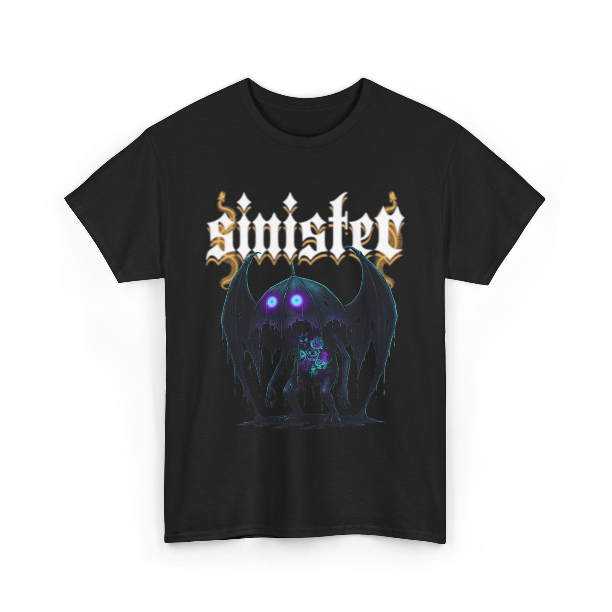 A dark, mood-driven tee made to sit quietly at the center of a shadowy wardrobe. Soft, midweight cotton holds a detailed, glow-like graphic of a wide-eyed, otherworldly creature beneath ornate gothic lettering. The design reads like a midnight sketch come alive — purples and blues bloom against black, giving the image a subtle, eerie luminescence without shouting for attention. Wear it to late shows, basement hangouts, or slow walks through neon-lit streets; it layers easily under a worn jacket or stands alone with worn-in jeans. This shirt feels like a secret shared among friends who prefer atmosphere over flash, and comfort over compromise.