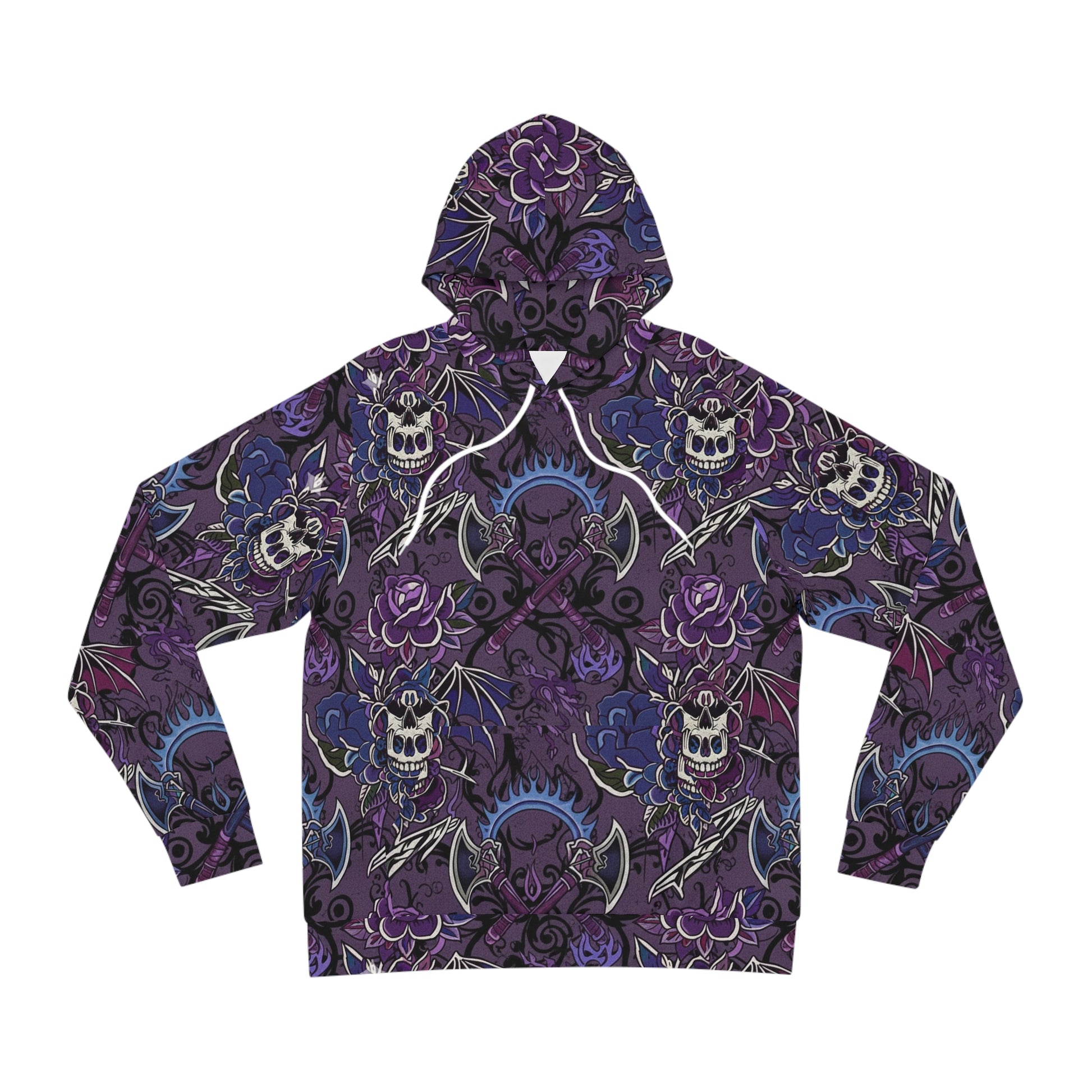Wrap yourself in a hoodie that feels like a midnight alley of ink and roses. Deep purples, sickle blades, bat wings and grinning skulls weave into a rich all-over print that reads equal parts gothic romance and street-ready edge. The fabric has weight and drape — warm without bulk — so it layers easily over band tees or under a leather jacket. Stretchy performance fibers keep the colors sharp across the print while the roomy kangaroo pocket and adjustable hood make it something you’ll reach for when the air turns cool or the scene calls for attitude. Wear it out to late-night shows, hideaway coffees, or when you want your look to speak in quiet, dark color.