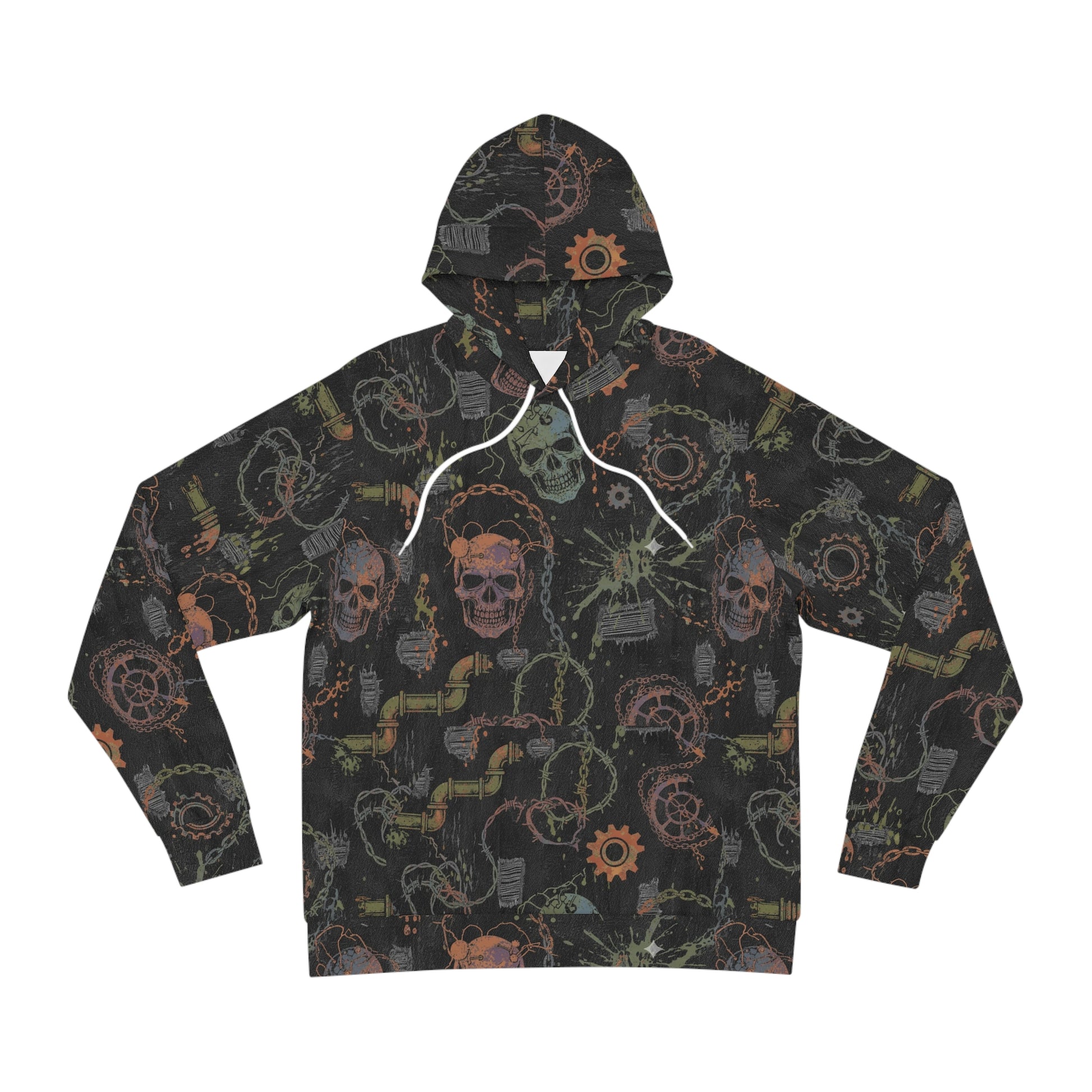 This hoodie brings a grungy, steampunk edge to everyday wear. Dark, weathered tones are layered with skulls, gears, chains and industrial motifs for a look that’s equal parts gritty and artful. Wear it on late-night rides, at underground shows, or when you want an extra layer that speaks your aesthetic without shouting. The medium-heavy fabric holds print detail while feeling substantial against the chill. A roomy kangaroo pocket and adjustable hood make it easy to wear over band tees or layered under a leather jacket for a lived-in, rebellious vibe.
