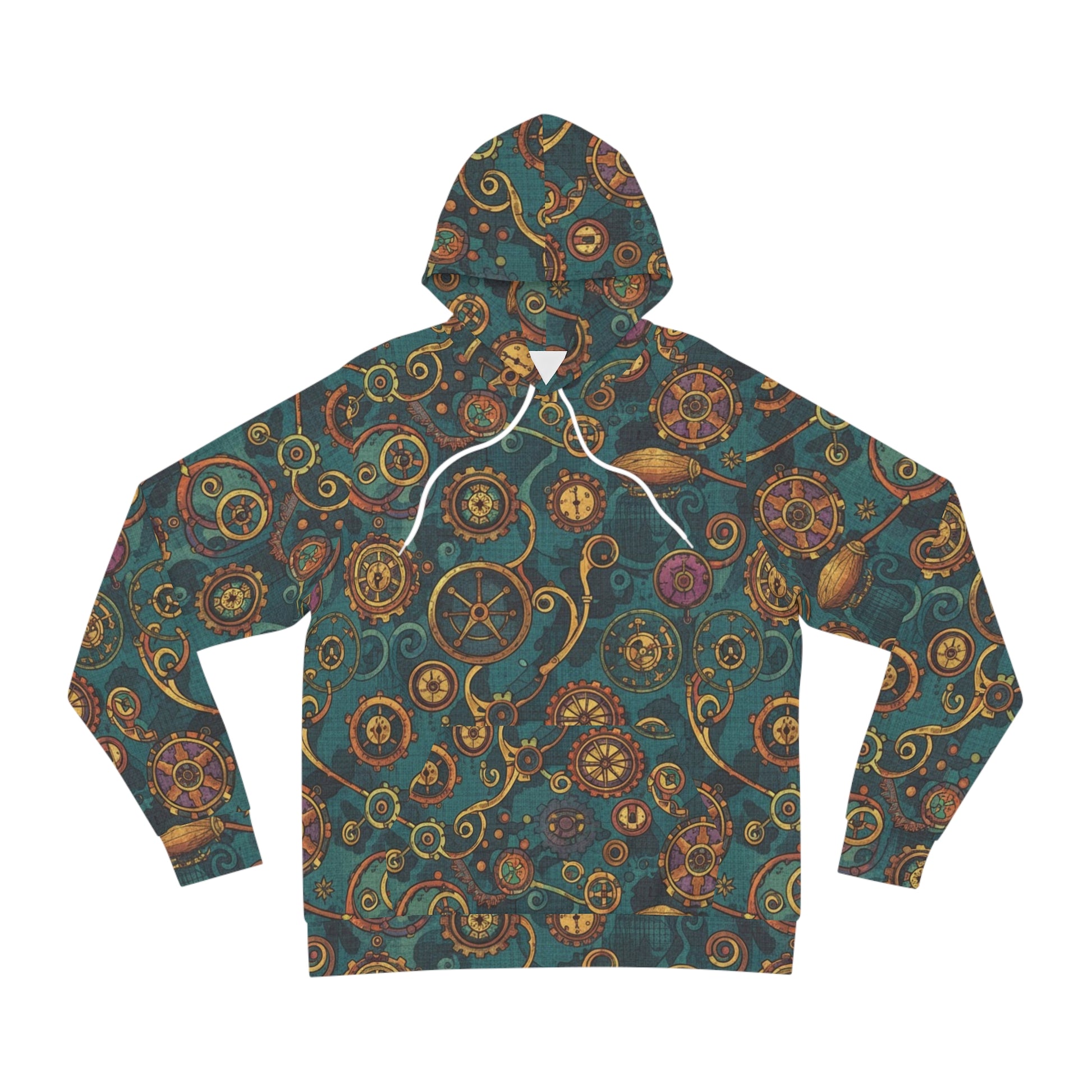 This hoodie wraps you in a rich, storybook mood — teal waves of swirling gears and nautical wheels, faded brass tones, and tiny compass faces. It reads like a travel journal from a clever inventor: weathered, curious, and quietly playful. The all-over print sits comfortably on medium-weight fabric so the pattern stays vivid while the garment still moves with you. Wear it when you’re wandering the harbor at dusk, sketching blueprints in a warm cafe, or layering for an evening maker’s meet. The roomy kangaroo pocket and adjustable hood add everyday usefulness while the printed care label and reinforced seams keep the piece feeling intentional and well-built. This hoodie becomes part of a creative routine — a reliable layer for people who like their style to tell a subtle story.