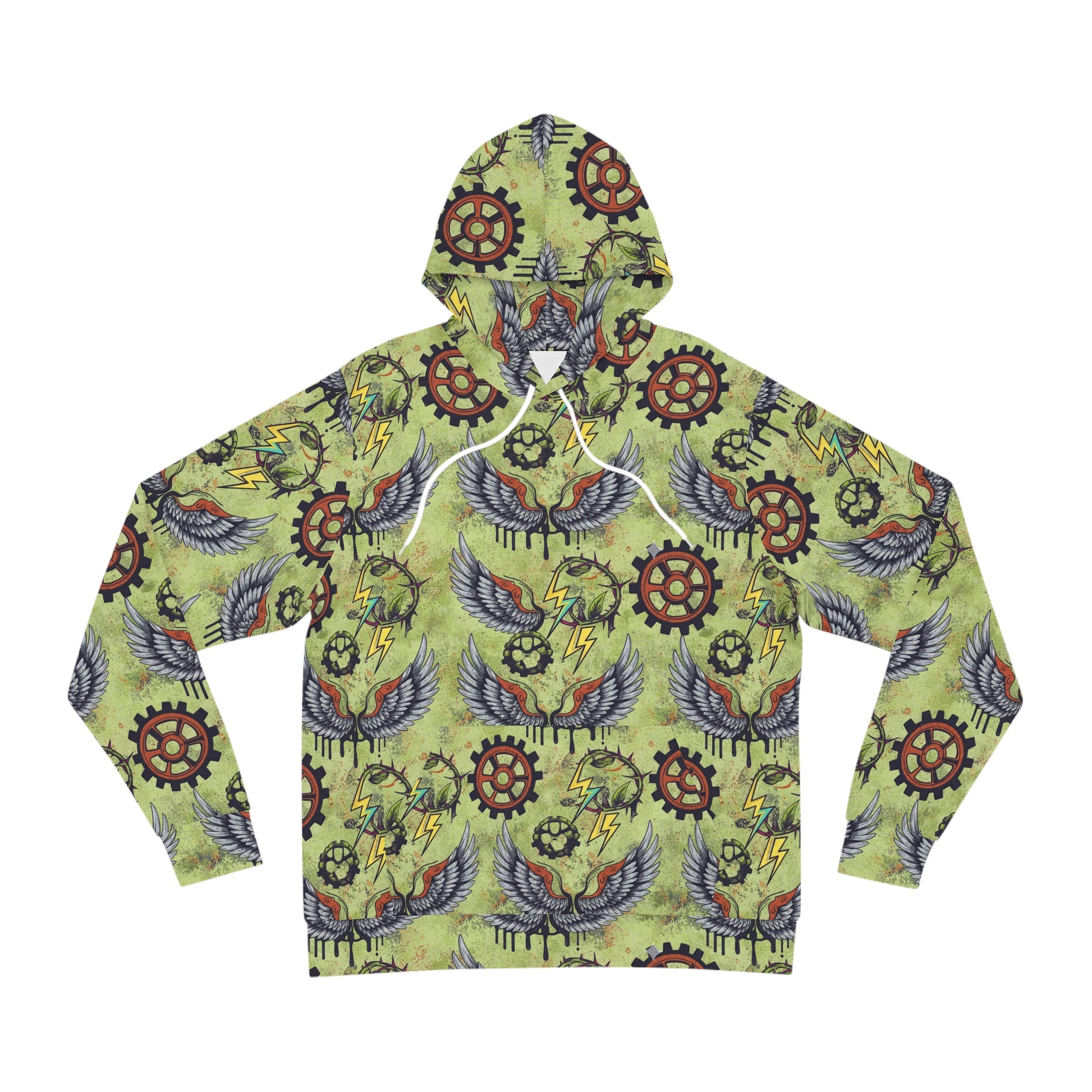 This hoodie brings a bold, gritty energy to your everyday rhythm. The all-over print mixes weathered gears, winged emblems and lightning bolts against a muted chartreuse background — a worn-industrial look that still feels alive. Slip it on when you want to carry that workshop, road-trip or maker-studio vibe into coffee shops and late-night hangs. The hood and roomy kangaroo pocket keep you comfortable while the slightly heavier fabric holds the print and shape through seasons of wear. It reads like a statement piece for someone who values craft, motion and a little edge.