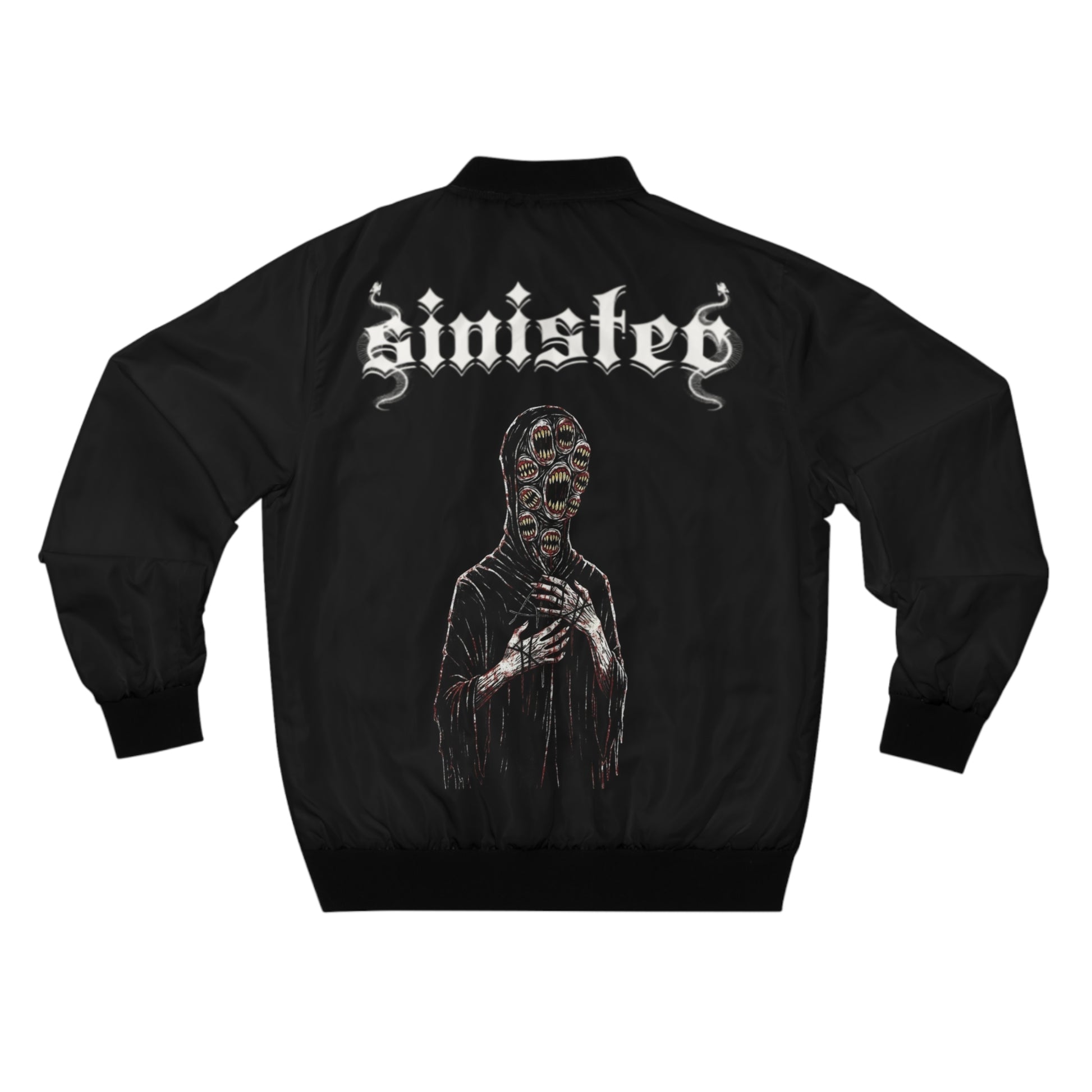 A dark, street-ready bomber that wears like a statement. This all-over black jacket carries a haunting, detailed back illustration and crisp gothic lettering on the chest, giving it a moody, underground edge. Lightweight but durable polyester blocks wind and light rain while keeping the print rich and uninterrupted from seam to seam. Ribbed cuffs, collar, and hem lock in warmth and silhouette. Slide your hands into the slanted side pockets or the lined welt pockets and zip up the full metal front for a clean, fortified look that reads like night on the move.