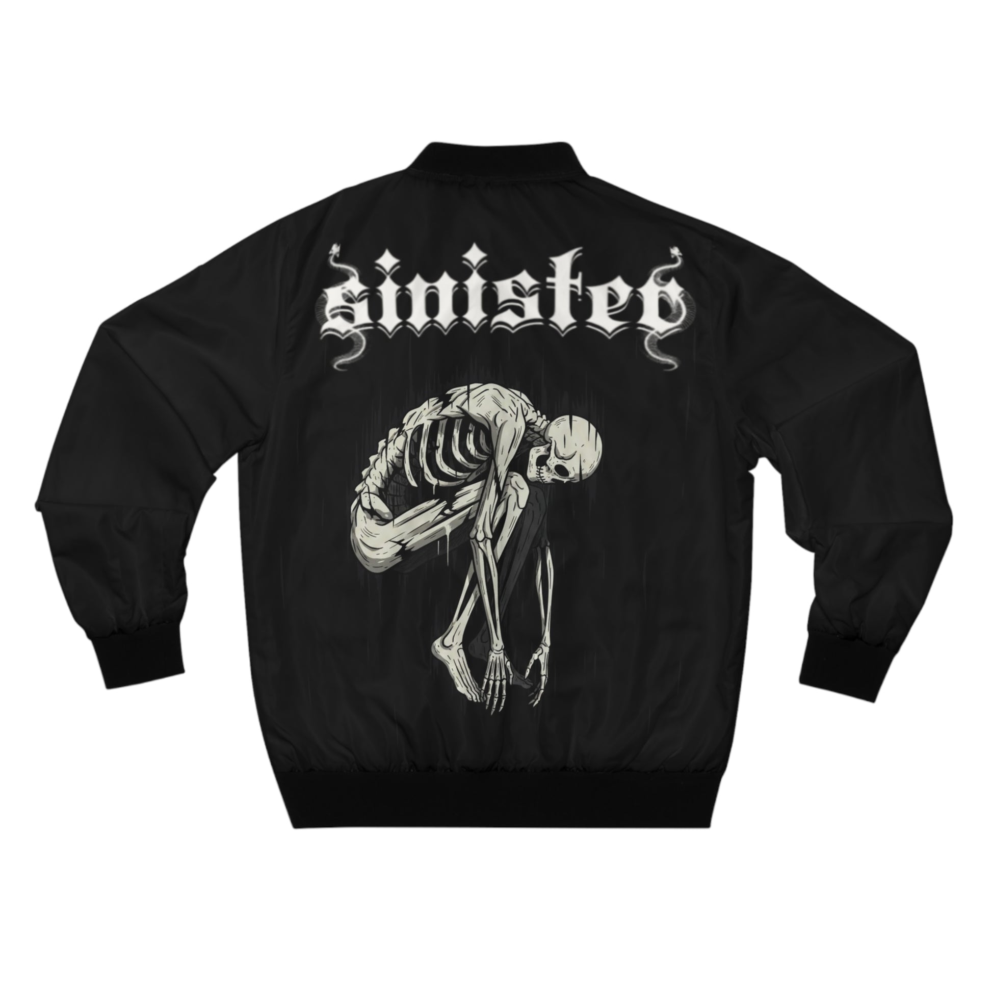 This bomber jacket carries a dark, atmospheric energy — a sleek black canvas with striking all-over artwork that reads like a midnight story. The front features a subtle gothic-wordmark, while the back shows a haunting, curled skeleton illustration that feels both vintage and visceral. Lightweight but sturdy polyester blocks wind and holds its shape, so the jacket moves with you through late-night walks, shows, and city streets. The rib-knit collar, cuffs, and hem give a classic bomber silhouette and keep the fit grounded. Slide your hands into the slanted pockets, zip up the metal front closure, and let the deep blue lining tuck you into something bold. Wear it when you want your style to speak in low tones — moody, deliberate, and a little rebellious.
