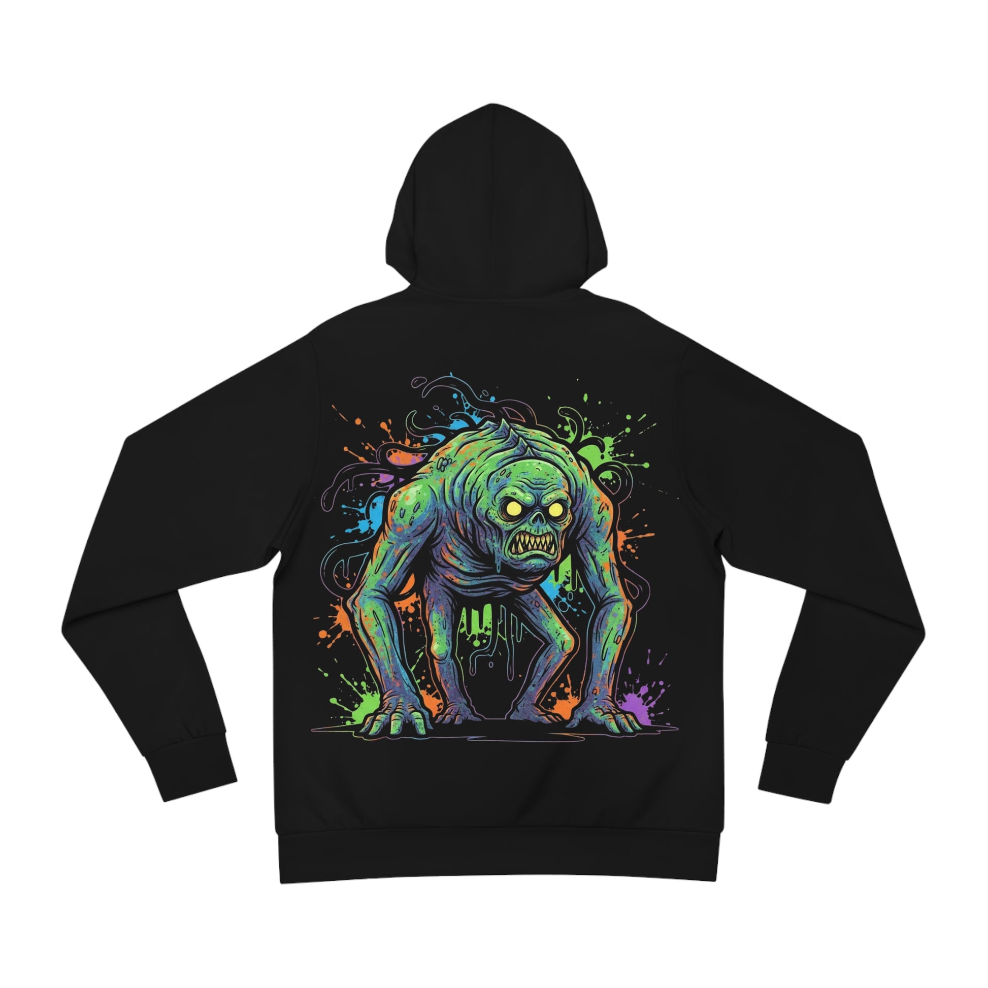 This hoodie brings night-street attitude and comic-horror energy into one wearable piece. The front shows an ornate, old-English wordmark rendered in metallic gold tones — a sharp, slightly haunted signature across the chest. The back explodes into color: a neon, crawler-like monster in gritty, splashy paint strokes that feel equal parts skateboard deck and late‑night graphic novel. It wears like a companion for long walks, midnight shows, or record‑store runs — warm, substantial, and loud without shouting. Comfortable heft and a roomy kangaroo pocket make it an everyday layer you reach for when you want to stand out and feel a little dangerous.