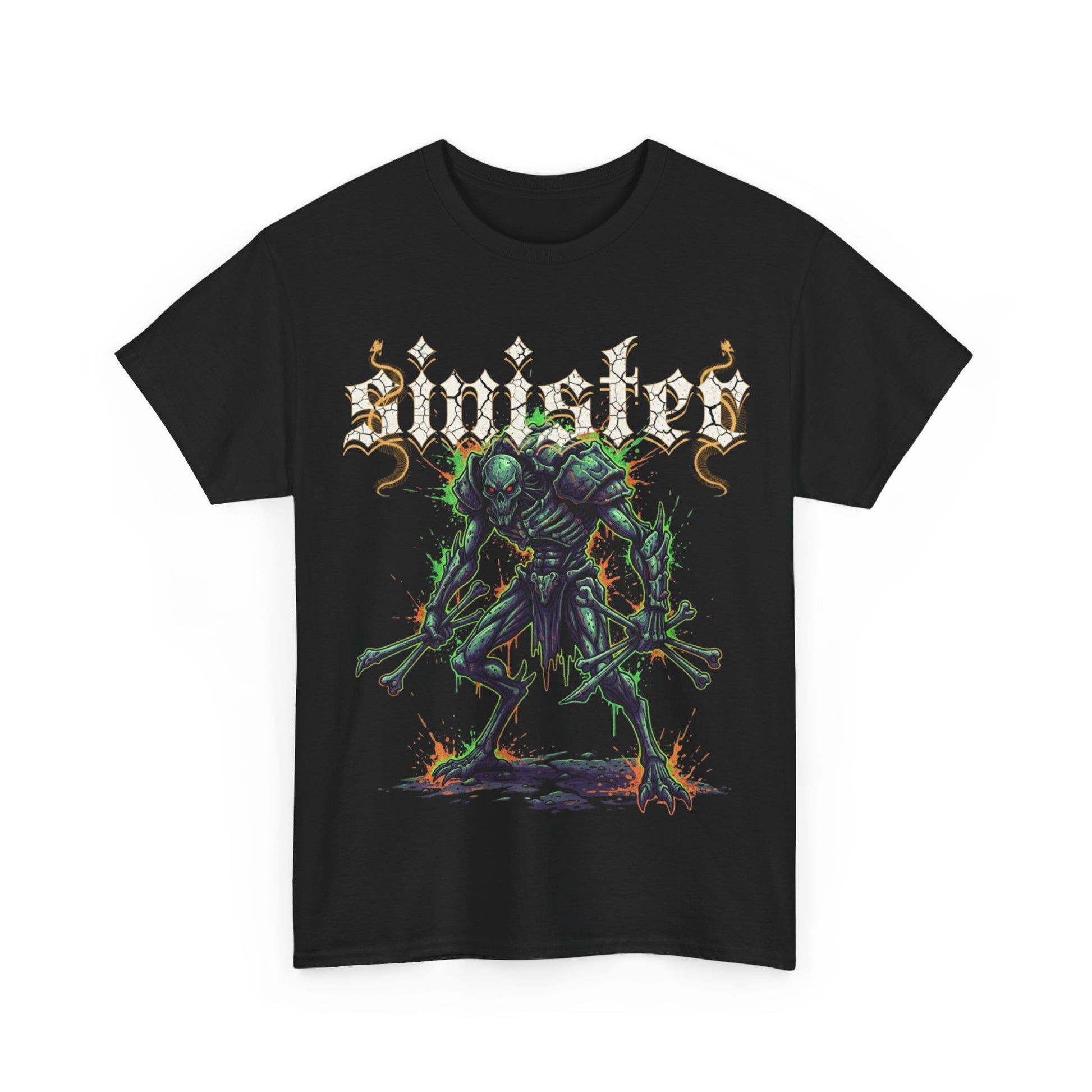 A rugged, statement-making tee for fans of dark fantasy and heavy music. This midweight cotton shirt wears like a favorite from day one — relaxed at the shoulders, built to last, and printed with an acidic, hand-drawn monster that looks like it crawled out of a late-night album cover. Slip it on before a basement show, a long drive with the windows down, or when you want your wardrobe to speak in snarls instead of small talk. The distressed gold-lettering and neon-infused creature graphic add an over-the-top edge that pairs naturally with worn denim, leather jackets, and stacked boots. Breathable, durable, and detailed where it counts, this tee becomes part of the ritual: show up loud, stay weird.