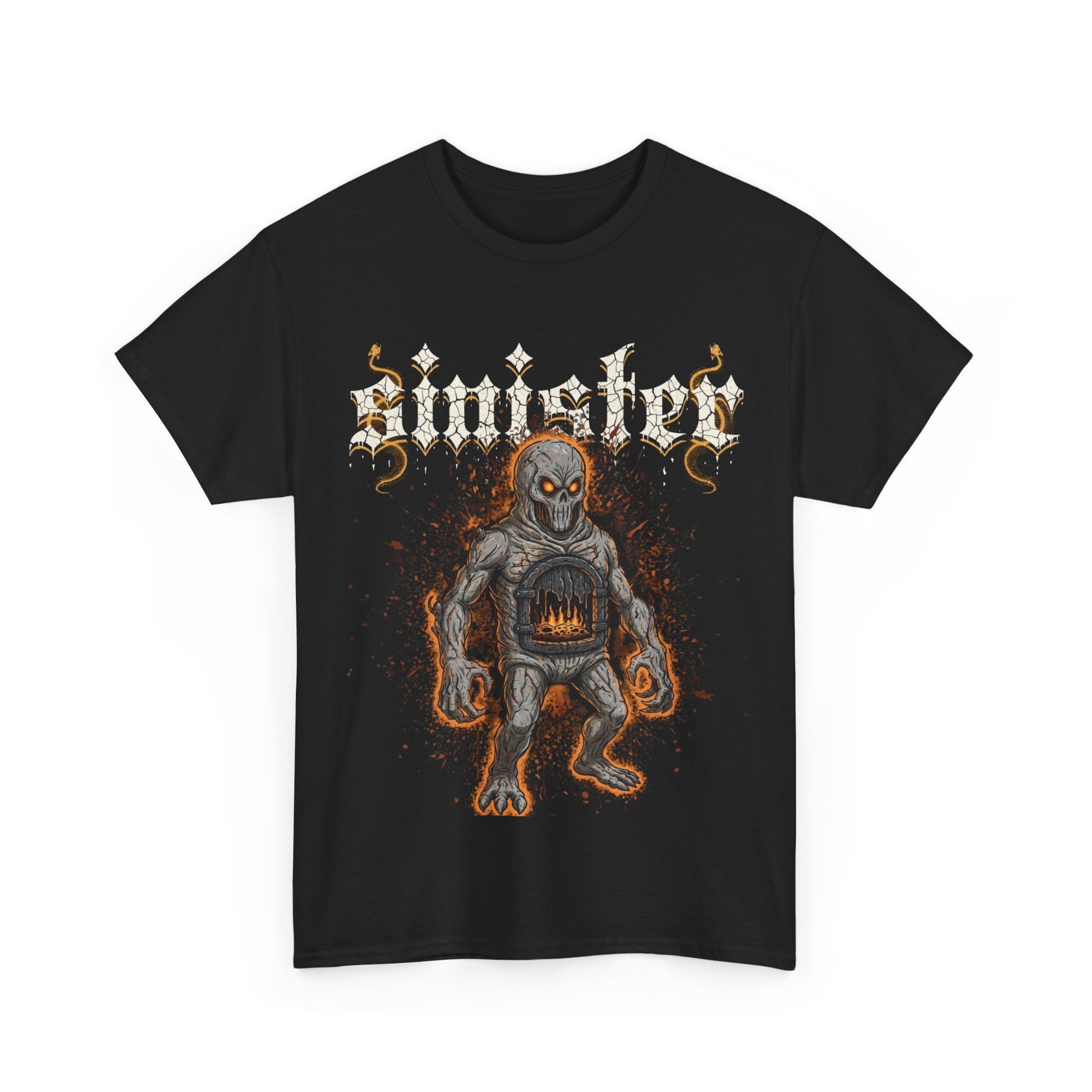 A bold, dark tee made to carry heavy-hitting artwork with clarity and comfort. This classic-fit cotton shirt shows off a gritty, hand-drawn monster with molten-orange accents and gothic lettering — the print pops against deep black for a worn, underground vibe. It drapes relaxed over the shoulders and the ribbed collar holds its shape after washes. Built from sturdy, ethically sourced cotton and printed with crisp DTF/DTG techniques, this shirt feels lived-in from the first wear and grows more characterful with time. Wear it to shows, late-night hangs, or when you want your look to speak louder than words.