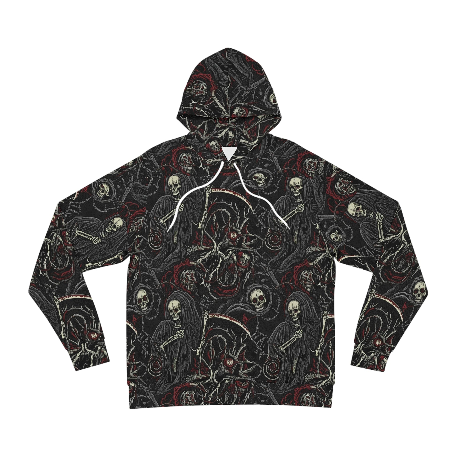 Wrap yourself in a restless, artful darkness with this all-over print hoodie. The dense pattern of skeletal figures, reapers and winding crimson accents feels like a midnight sketchbook come to life — moody, detailed, and quietly dramatic. Built for those who favor statement layers, it settles into the wardrobe as a wearable scene: pull up the hood, slip your hands into the roomy kangaroo pocket, and feel a little more at ease when the world leans grim. The fabric has a smooth, durable hand that keeps printed lines crisp while still feeling comfortably substantial. This is for late-night walks, underground shows, or quiet hours when you want your clothes to tell a story as dark and detailed as your playlists.