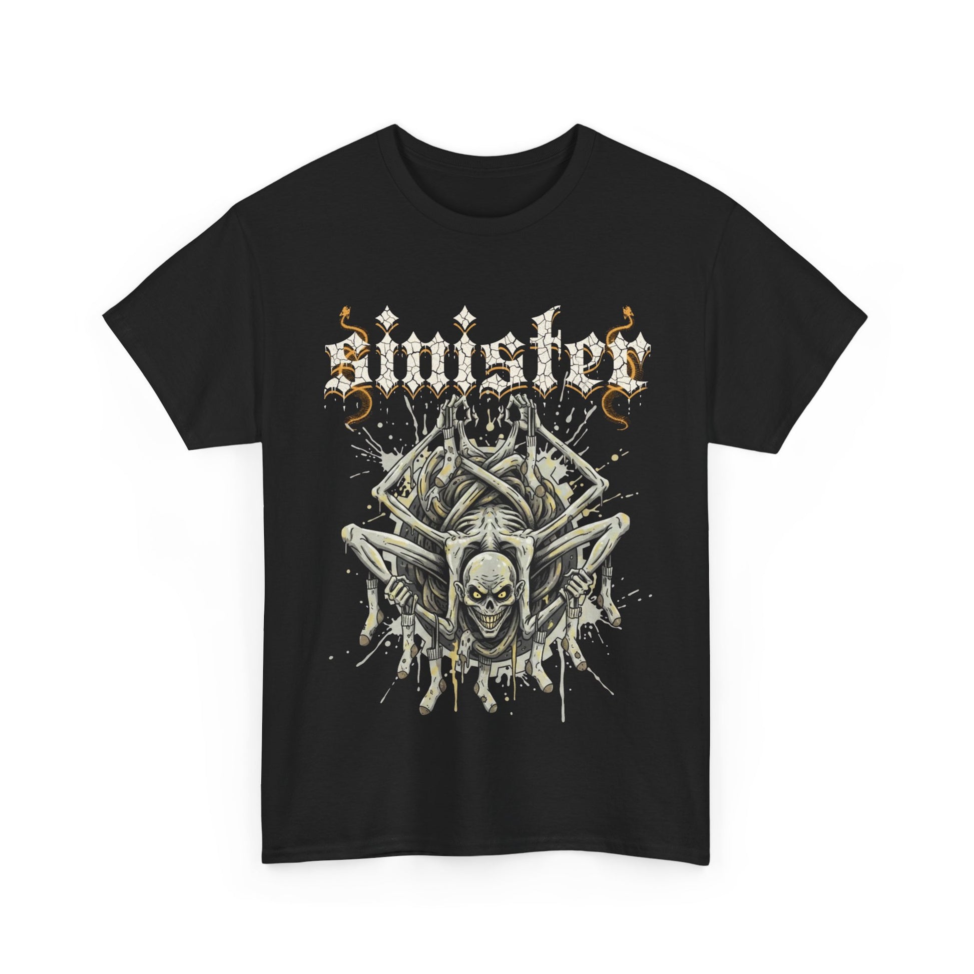 This black graphic tee carries a dark, visceral energy—hand-drawn bones, a grim skull and twisted, thorn-like forms converge beneath a distressed, gothic wordmark. It sits heavy on contrast: pale, detailed art against deep black fabric for a striking, stage-ready look. Wear it to shows, late-night rides, or when you want your shirt to do the speaking. The medium-weight cotton holds print detail beautifully and keeps its shape through repeat wear. Tear-away label and reinforced shoulders add low-key comfort for long sets and long nights.