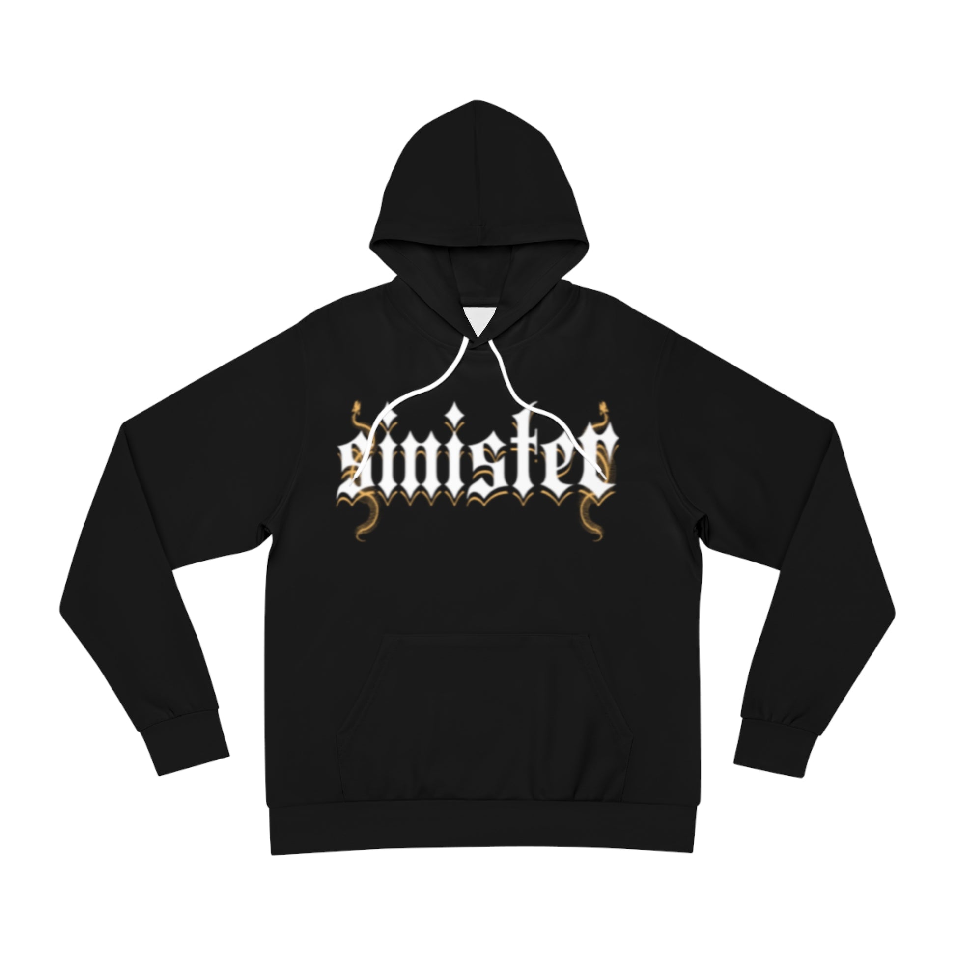 This midweight hoodie brings together dark, gothic energy and street-ready comfort. The front features a sharp, old-English-style wordmark with distressed gold flourishes; the back displays a high-contrast, hand-rendered creature motif that reads like a fossilized emblem. Wear it layered over a tee or under a coat when the air turns cold. It holds shape through repeated wear thanks to reinforced seams, and the roomy kangaroo pocket keeps hands warm between sets of errands or late-night walks. The black background makes the monochrome back art pop, while the gold-accented front adds a hint of ornate edge — a piece for people who like their wardrobe moody, textured, and a little unexpected.