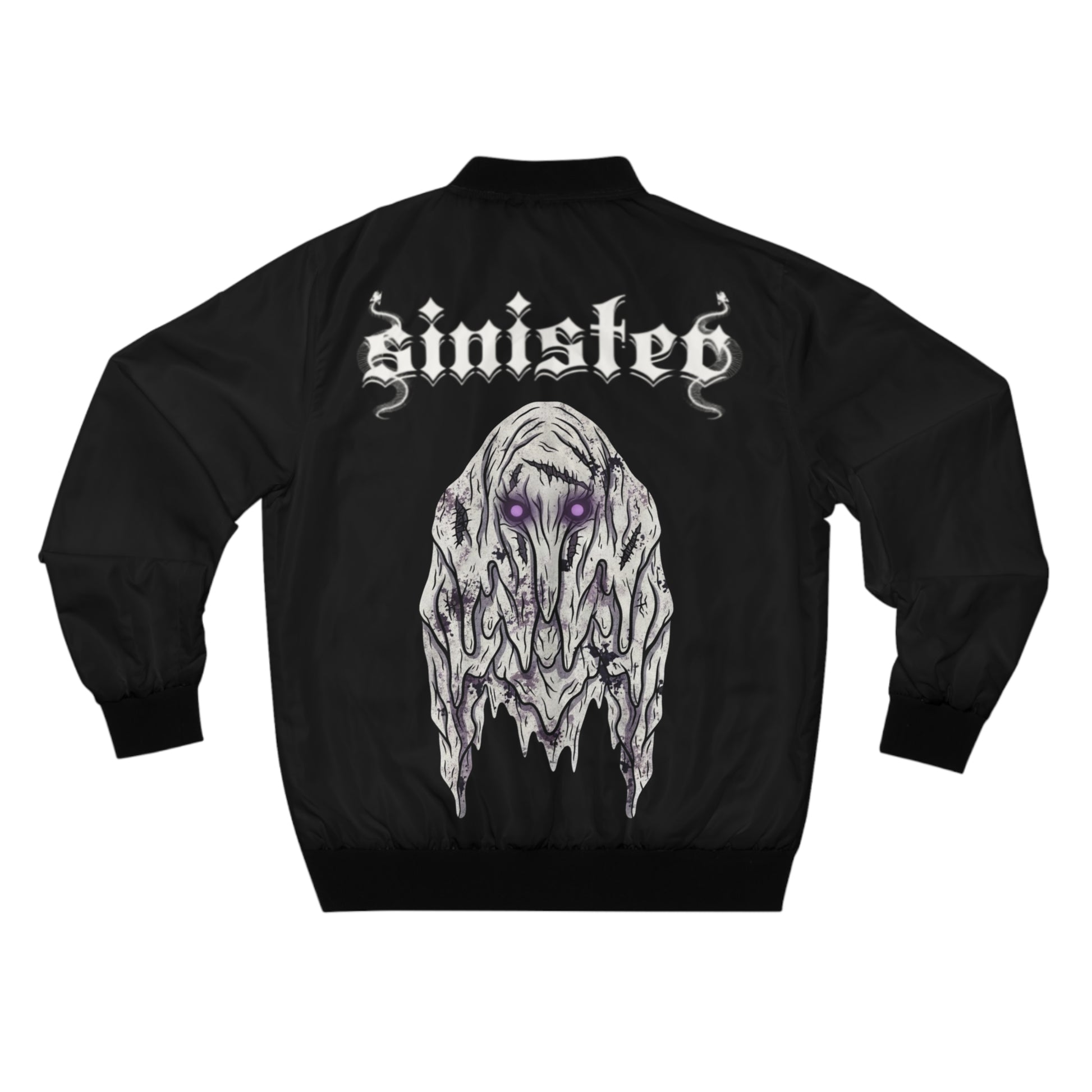 This bomber jacket brings dark, atmospheric style to everyday wear. The front carries a subtle, gothic wordmark while the back features a haunting, dripping specter with glowing violet eyes — a bold statement for those who favor moody, alternative aesthetics. Lightweight yet durable polyester holds the all-over print clearly, while rib-knit cuffs, collar and hem give a classic bomber silhouette. Pockets and a sturdy metal zipper add practical function so it moves from late-night shows to city streets with ease.