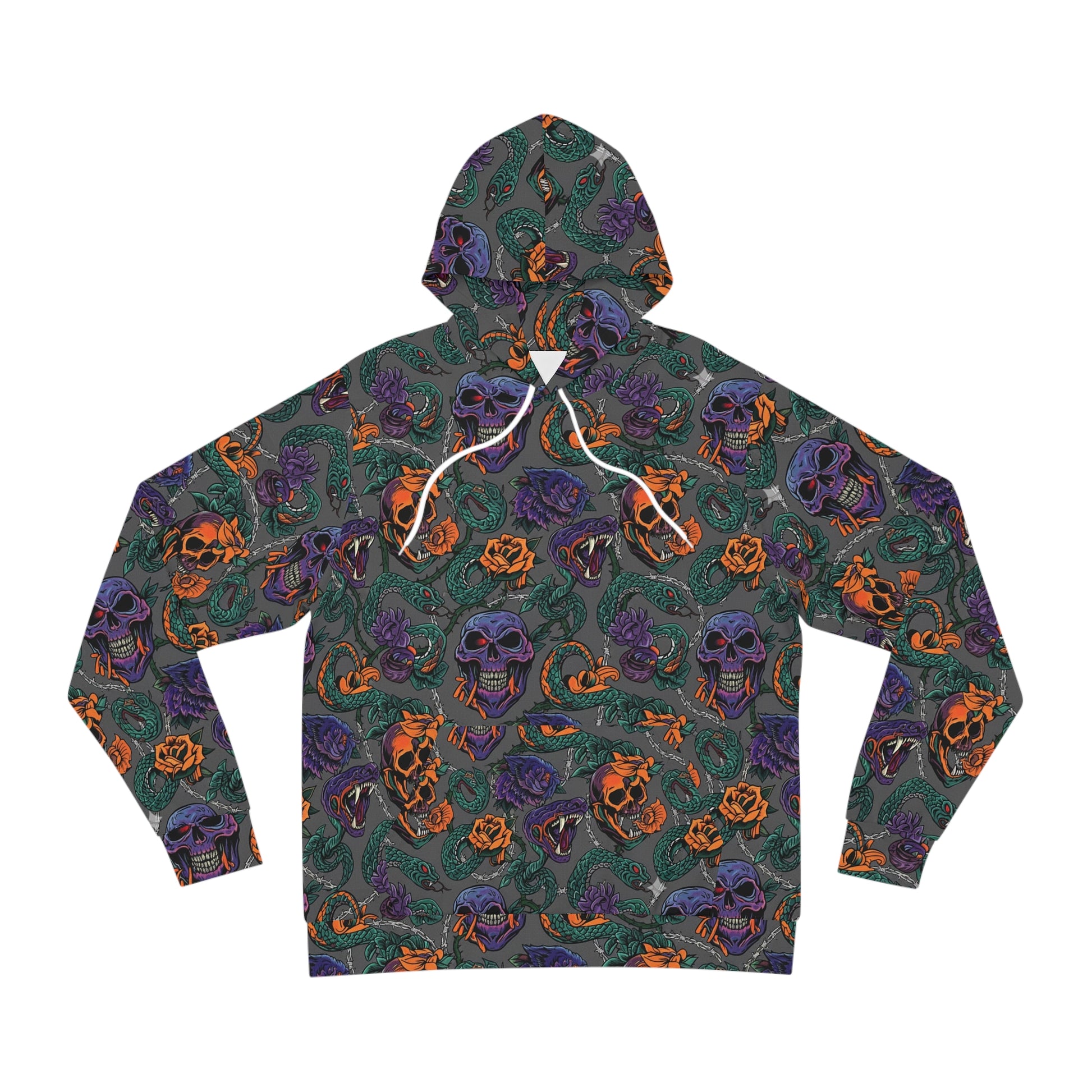 This all-over print hoodie wraps bold, moody artwork into a wearable statement. Deep forest-green tones set the backdrop for vivid purple skulls, curling serpents, and burnt-orange roses — a mix of gothic edge and artistic detail that feels both rebellious and thoughtful. The medium-heavy fabric drapes with substance and the roomy kangaroo pocket and adjustable hood add everyday comfort. Wear it on late-night walks, to underground shows, or when you want an outfit that speaks in riffs and inked sketches. The printed care label keeps the interior clean while the double-needle topstitching and durable blend ensure the print and shape hold up through repeat wears and washes.