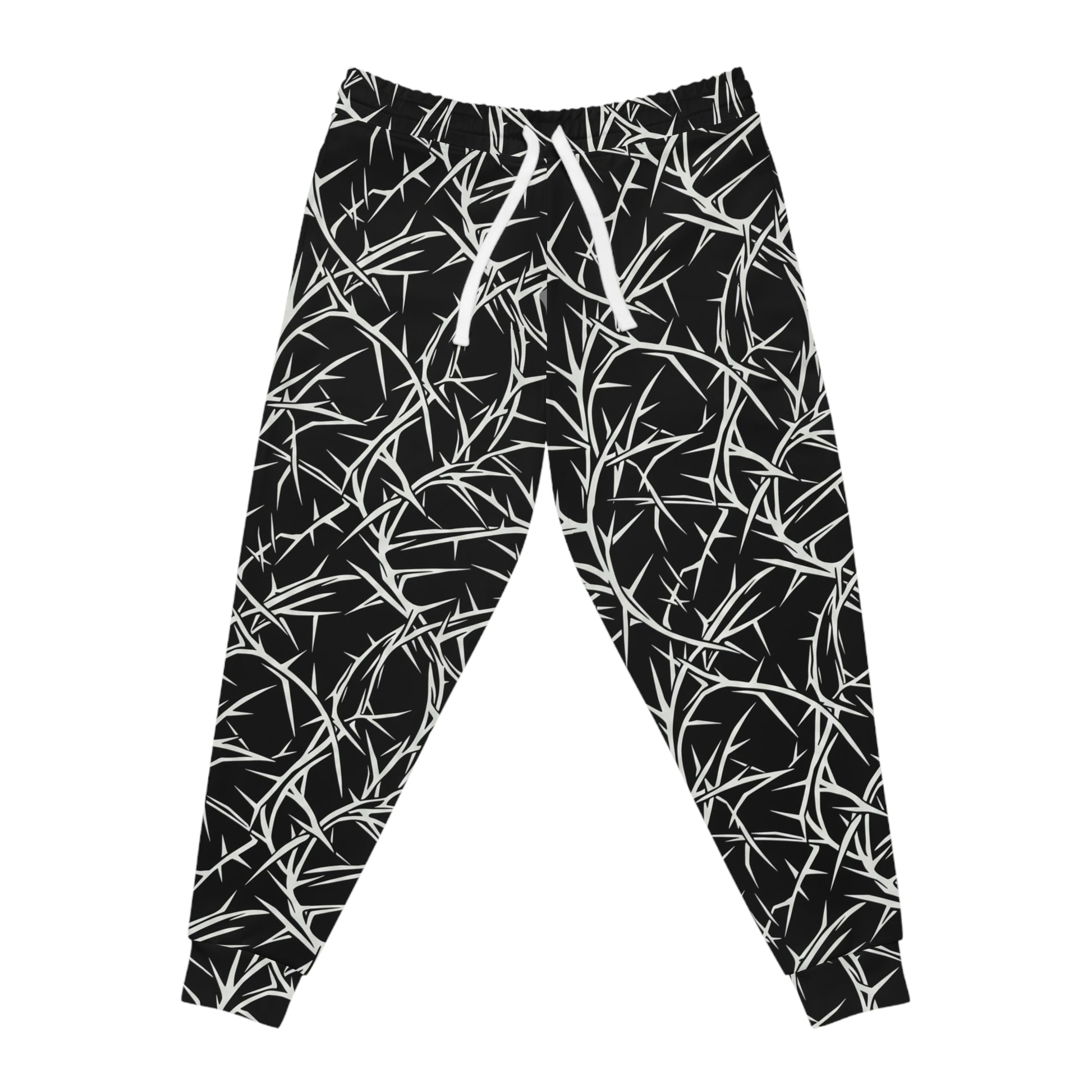 These joggers blend movement-ready comfort with a bold monochrome pattern that reads like wind-swept grass at midnight. The fabric feels soft and lightweight against the skin, with gentle stretch that follows every step — whether you’re stretching before a run, walking the city at dusk, or lounging with a book. Deep double-layer side pockets hold your phone and keys without bulking the silhouette. A white drawstring and matched seam threads keep the look cohesive while the all-over print gives a modern, slightly rebellious edge to everyday athleisure. Slip them on for slow mornings, active afternoons, or low-key nights out.