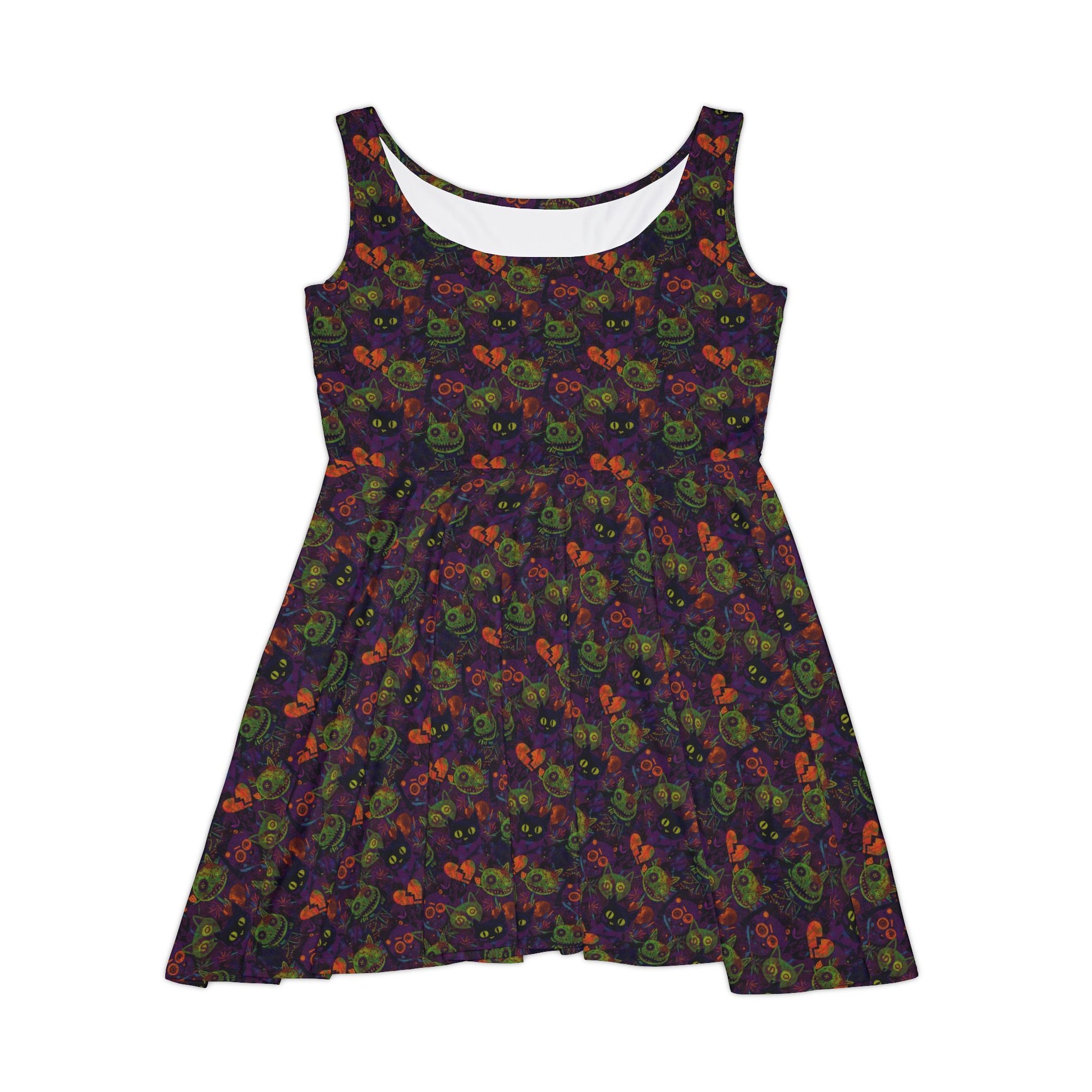 A playful skater dress that brings mischievous charm to cooler nights. The mid-length, high-cut neckline and flared skirt create a lively, twirl-ready silhouette that moves with you. Printed in rich, saturated colors on a medium-heavy polyester-spandex blend, the fabric holds crisp detail while offering stretch and comfortable recovery. Double-needle stitching along the sleeves, neck and hem adds durability for repeated wear. The asymmetrical skirt gives a slightly edgy, handmade feel—great for layering with tights, boots, and a chunky cardigan when the season leans spooky or cozy. Let it be the go-to piece for nights out at autumn markets, themed gatherings, or whenever you want one outfit that’s equal parts playful and wearable.