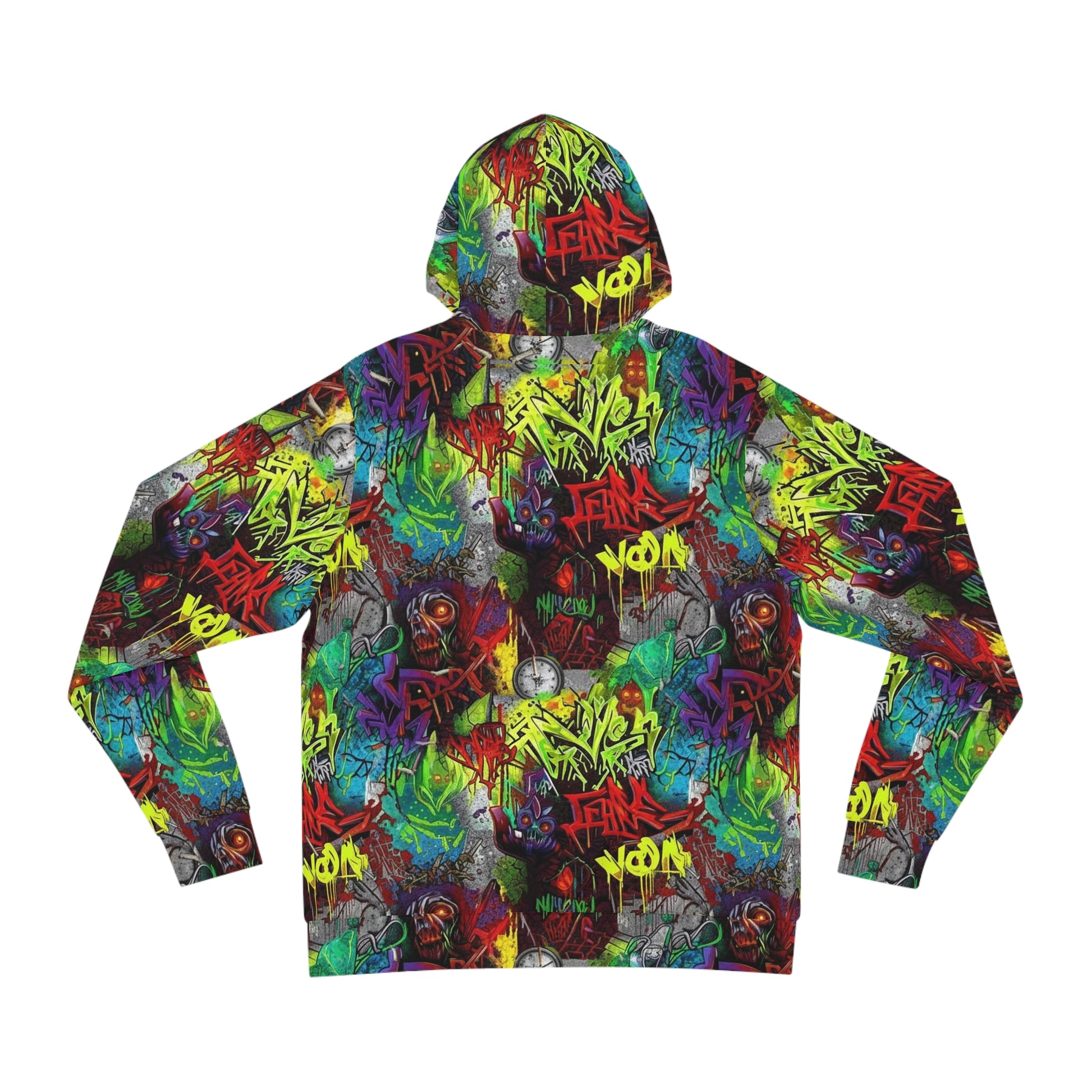 This hoodie brings the streets with you. Bright, layered graffiti spills across every inch — neon tags, stenciled faces, paint drips and gritty textures blend into one continuous wraparound print. It feels like walking through an alley full of expression: loud, restless, and alive. The roomy hood and kangaroo pocket add everyday comfort so the art can travel with you from skate parks to late-night meetups. Wear it when you want to stand out in crowds, lean into urban energy, or keep the skyline of your neighborhood close to your chest.